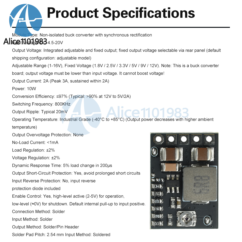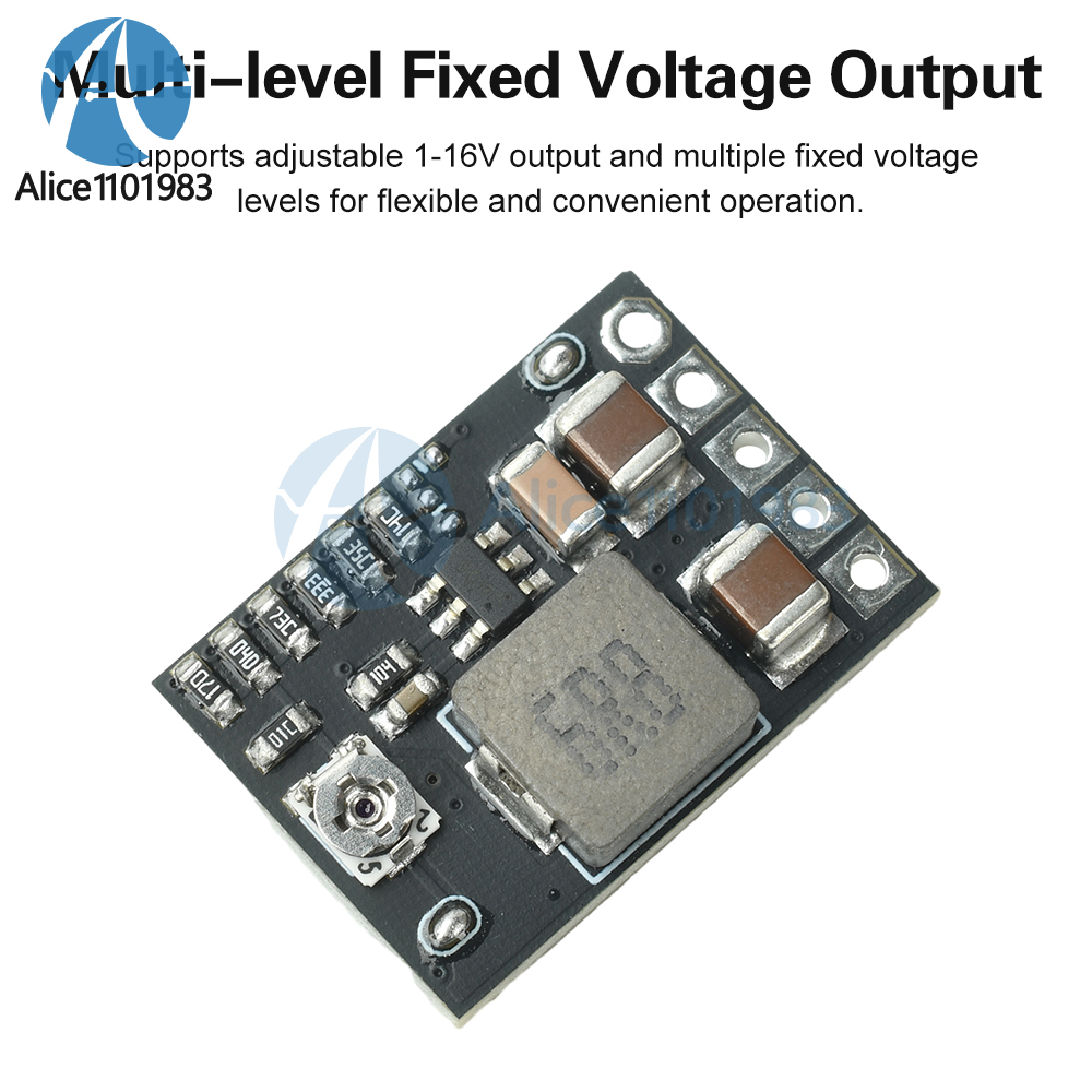 Adjustable range (1-16V), fixed voltage (1.8V/2.5V/3.3V/5V/9V/12V). Attention: This is a voltage reducing board, the output voltage must be lower than the input voltage, and cannot be boosted!