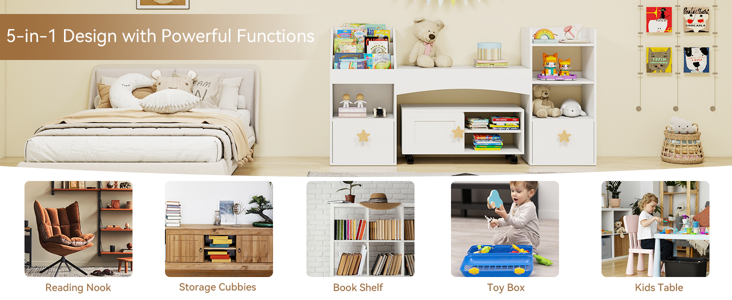 5-in-1 Kids Bookshelf: ELECWISH multifunctional masterpiece perfectly combines a desk, storage grid, bookshelf, mobile toy box, creating an orderly and joyful reading nook for the child. At the same time, it facilitates children to take and put books and toys, keeping the space tidy.