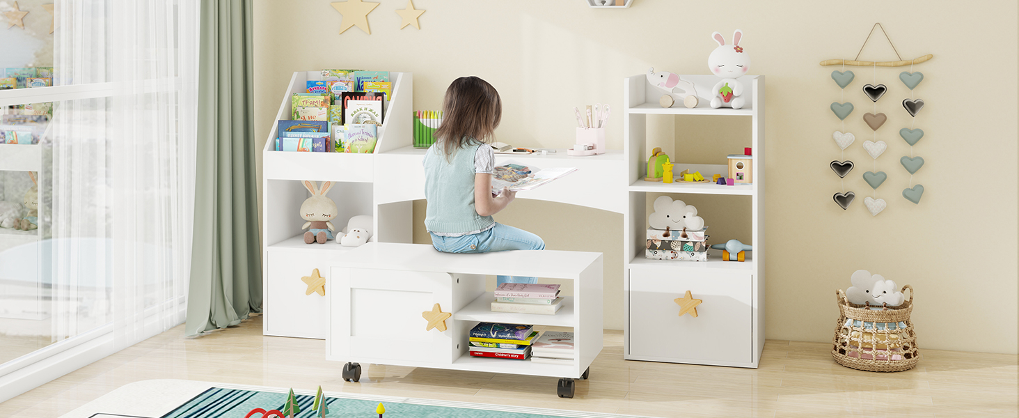 Plenty of Storage Space: Our design incorporates a desk and bookshelf storage into one efficient unit. The bookshelf has 3 tiers to display your child's books in an organized manner. With spacious compartments, drawers and a mobile cabinet, there is plenty of room for toys and art supplies. The mobile cabinet can also be used as a bench. Keep your child's room organized while developing storage habits.