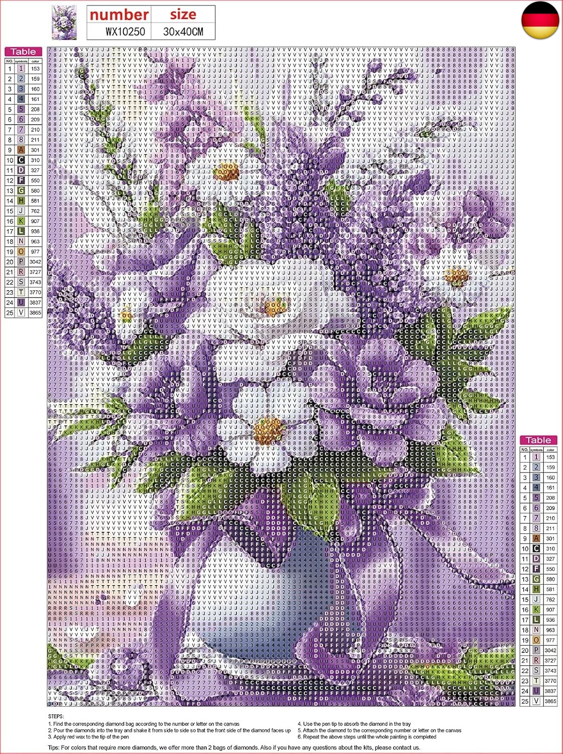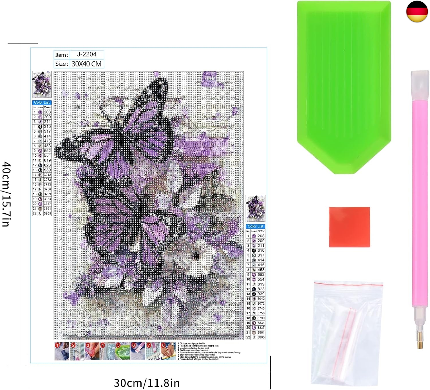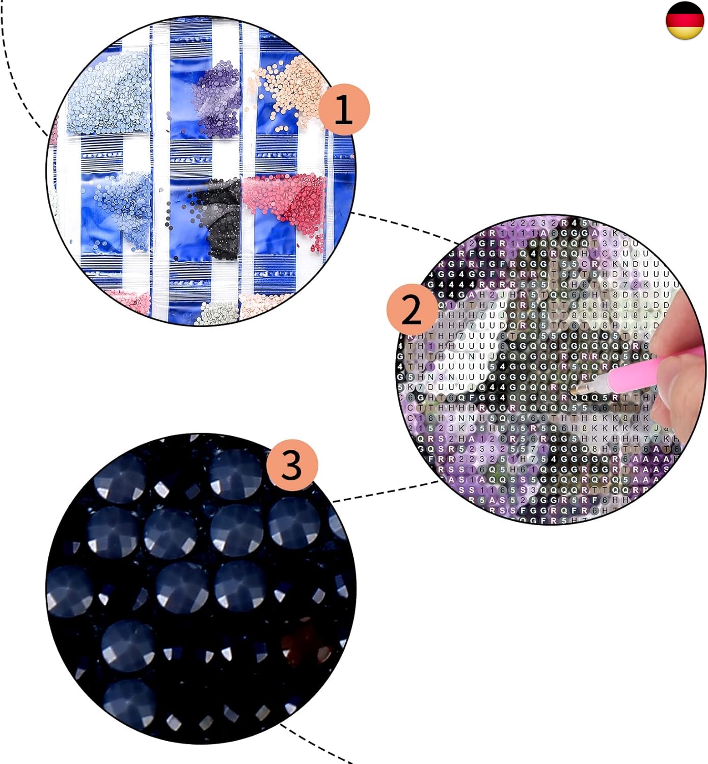 Einfach zu malen Dank HD-Leinwand und MEHRFACH-Werkzeug Der Prozess ist ganz einfach dank den Klaren Symbolen auf HOCHKLARE Drucköl-Leinwand und MEHRFACH-Werkzeug ,welche in unserem Zubehör-Bereich inklusive ist! Man kann damit 3/6 Diamantsteinen auf einmal aufnehmen und in einer gerade Linie auf der Leinwand positionieren. Dies beschleunigt das Befüllen großer Farbblöcke. Wir haben auch PINZETTE für Sie,damit Man einen falsch platzierten Diamantstein leicht wieder entfernen kann