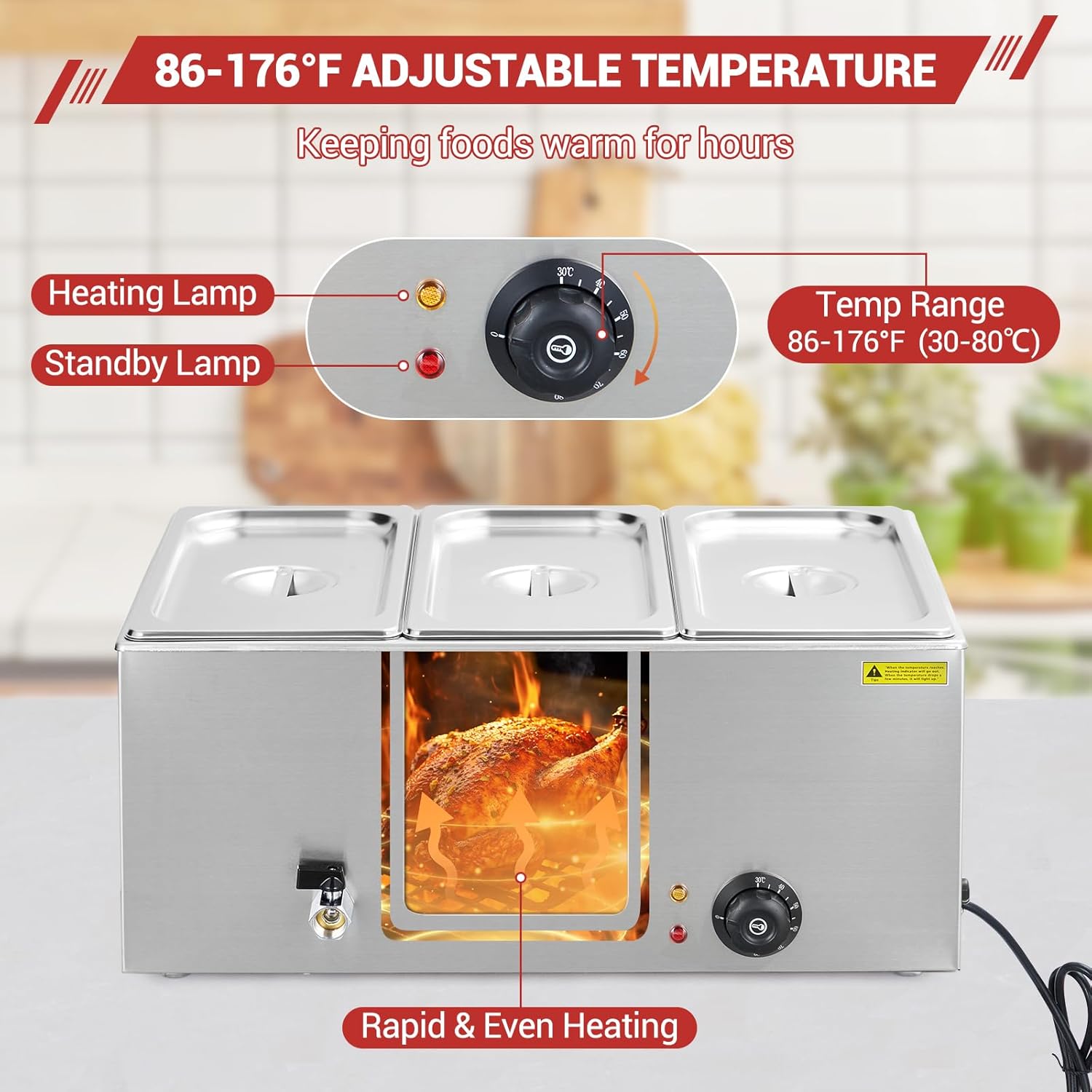 Adjustable heating ranging from 86°F to 176°F (30°C to 80°C) ensures optimal warmth for different types of foods—from delicate sauces to hearty stews. The built-in auto-stop feature not only maintains consistent efficiency but also provides peace of mind by preventing overheating, keeping your dishes safe and perfectly warmed for hours.