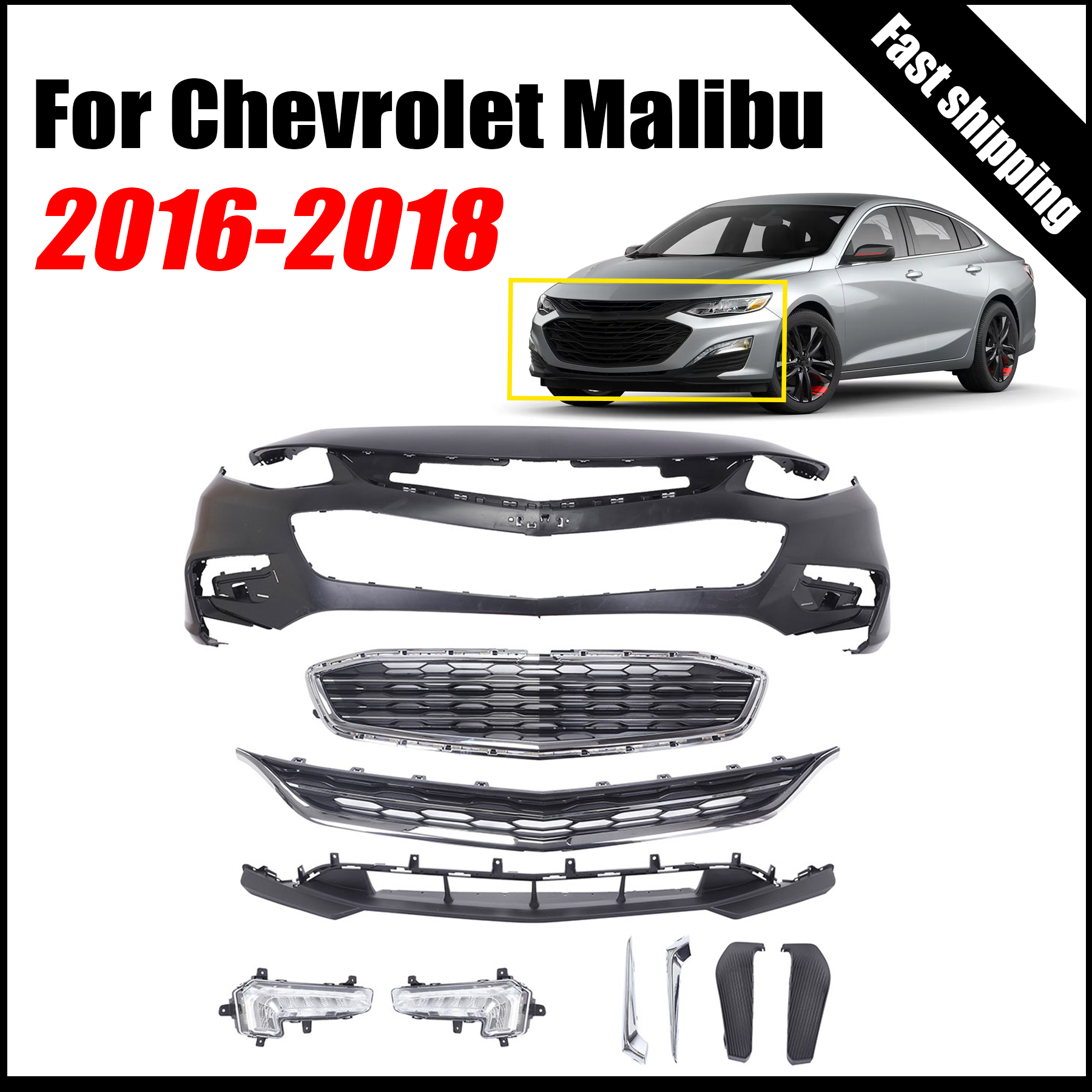 Front Bumper Complete Cover Grill Grille Fog light Trim For Chevy Malibu 16-18