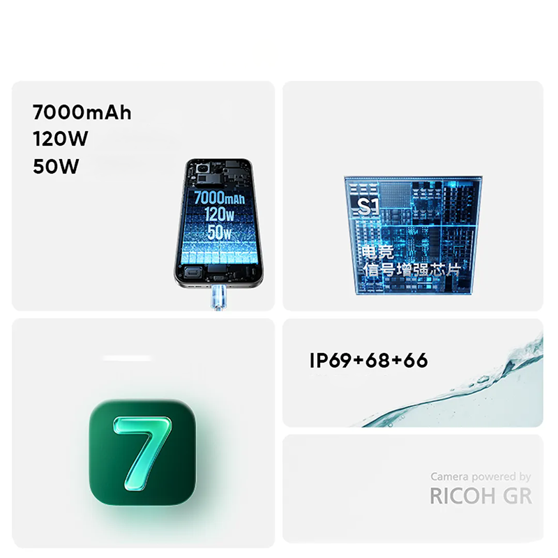 | Charging | 120W wired, 120W UFCS, 14.4W PD, 55W PPS, 14.4W QC, 15 min to 50%, 43 min to 100% 50W wireless, 79 min to 100% |