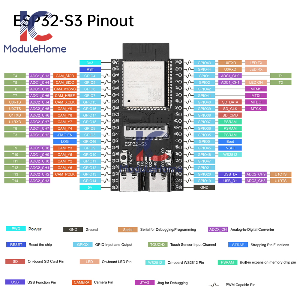 1.ESP32-S3 WROOM is designed based on the ESP32S3-WROOM-1 module with PCB on-board antenna.