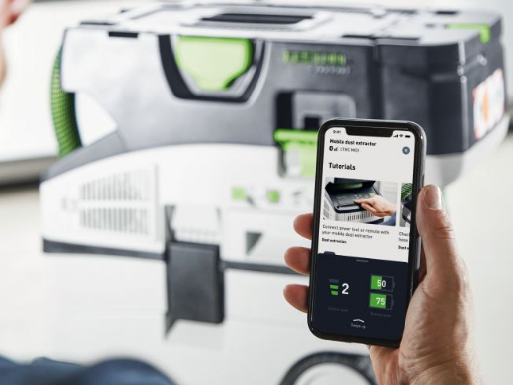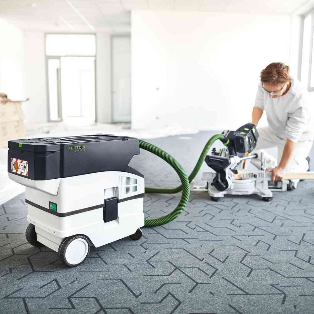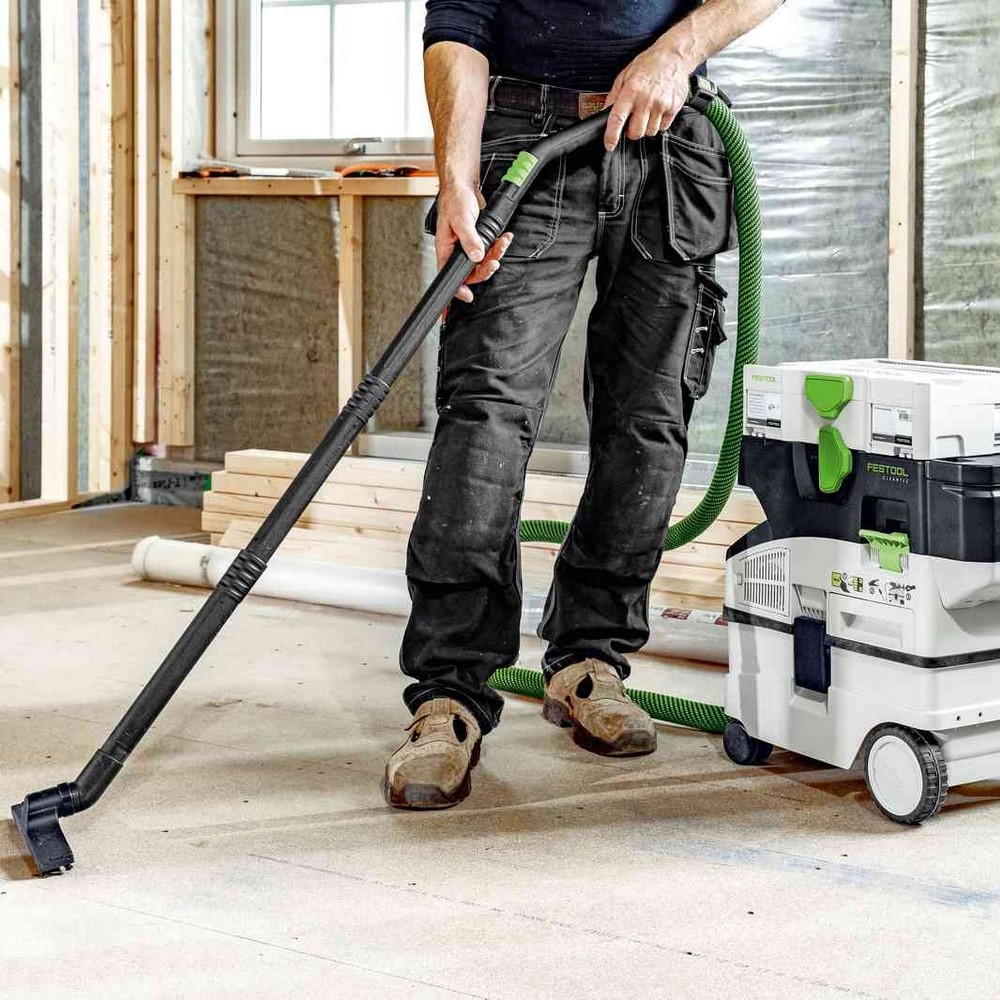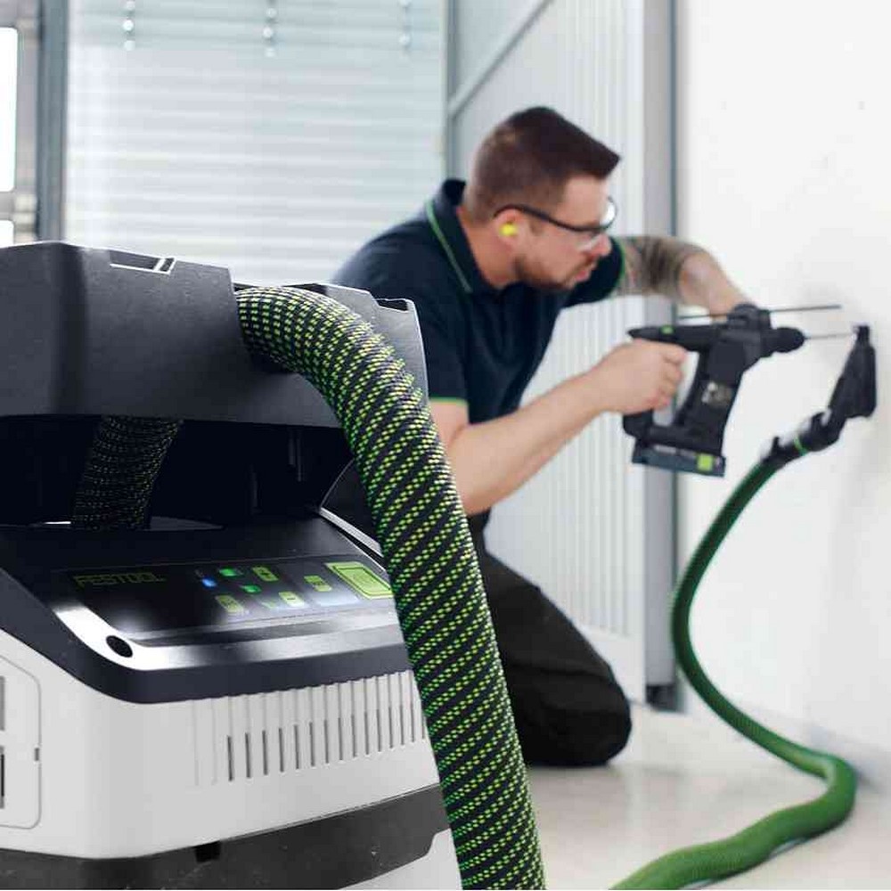 Powered by a 36V turbine (2 x 18V battery packs), this extractor provides performance comparable to corded models, making it perfect for mobile sawing, sanding, and drilling applications. Its compact design and low weight make it easy to transport, while Bluetooth® connectivity allows seamless interaction with Festool cordless tools.