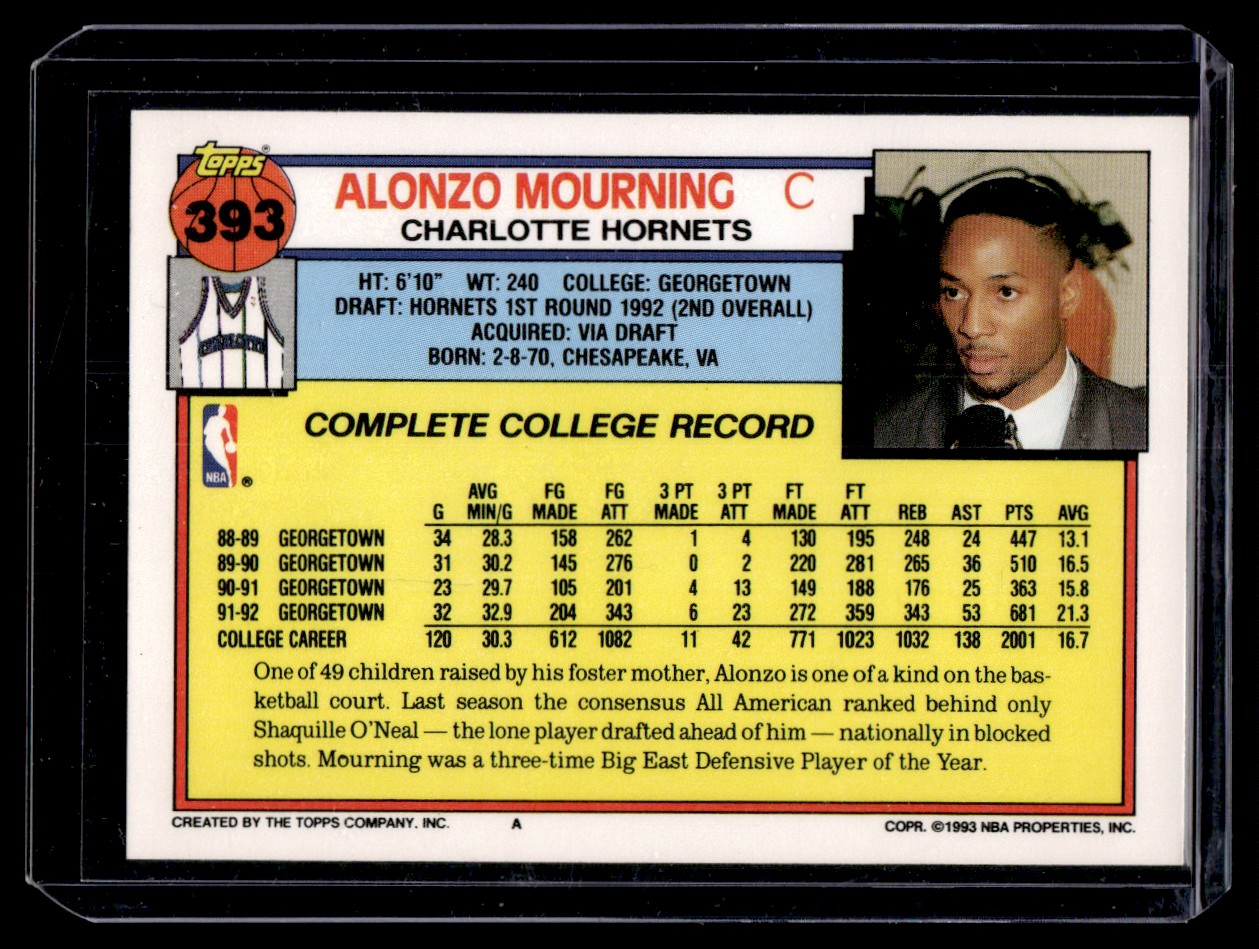 | 1992-93 Topps Alonzo Mourning Rookie Charlotte Hornets #393 |