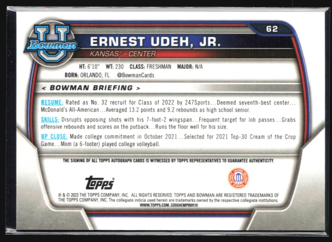 | ERNEST UDEH JR. AUTO 2022-23 BOWMAN CHROME UNIV #62 PARALLEL |