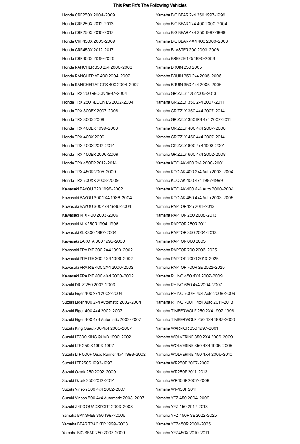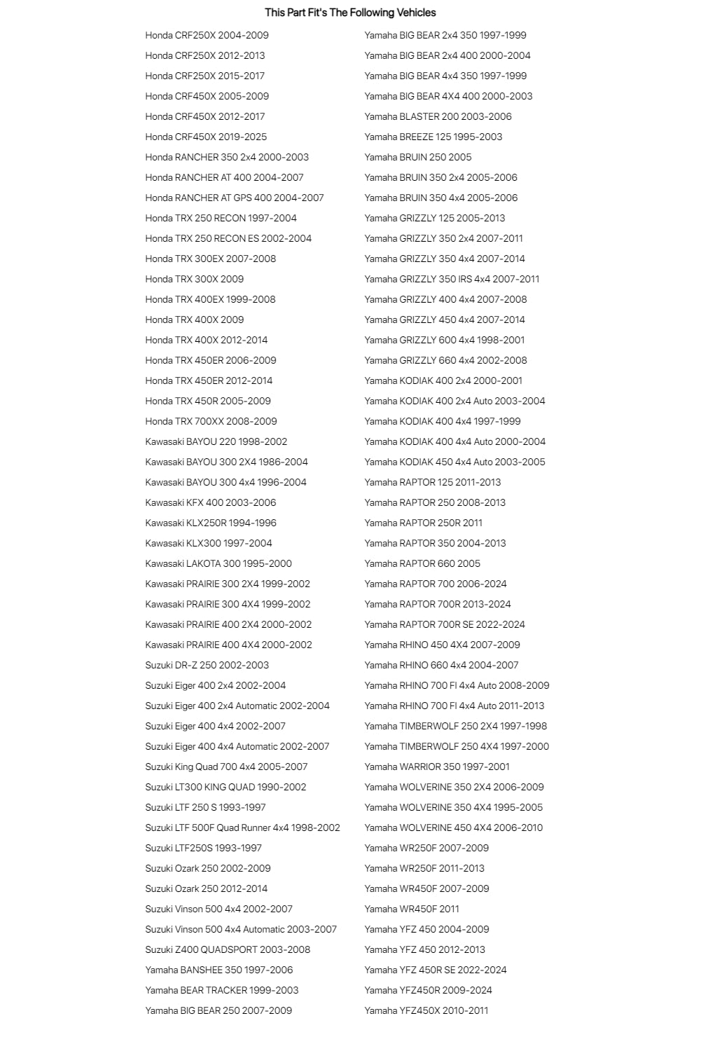 Special Notes:Fits only the hood lights, not the handlebar mounted light on the Suzuki Vinson 500 & King Quad 700 models.