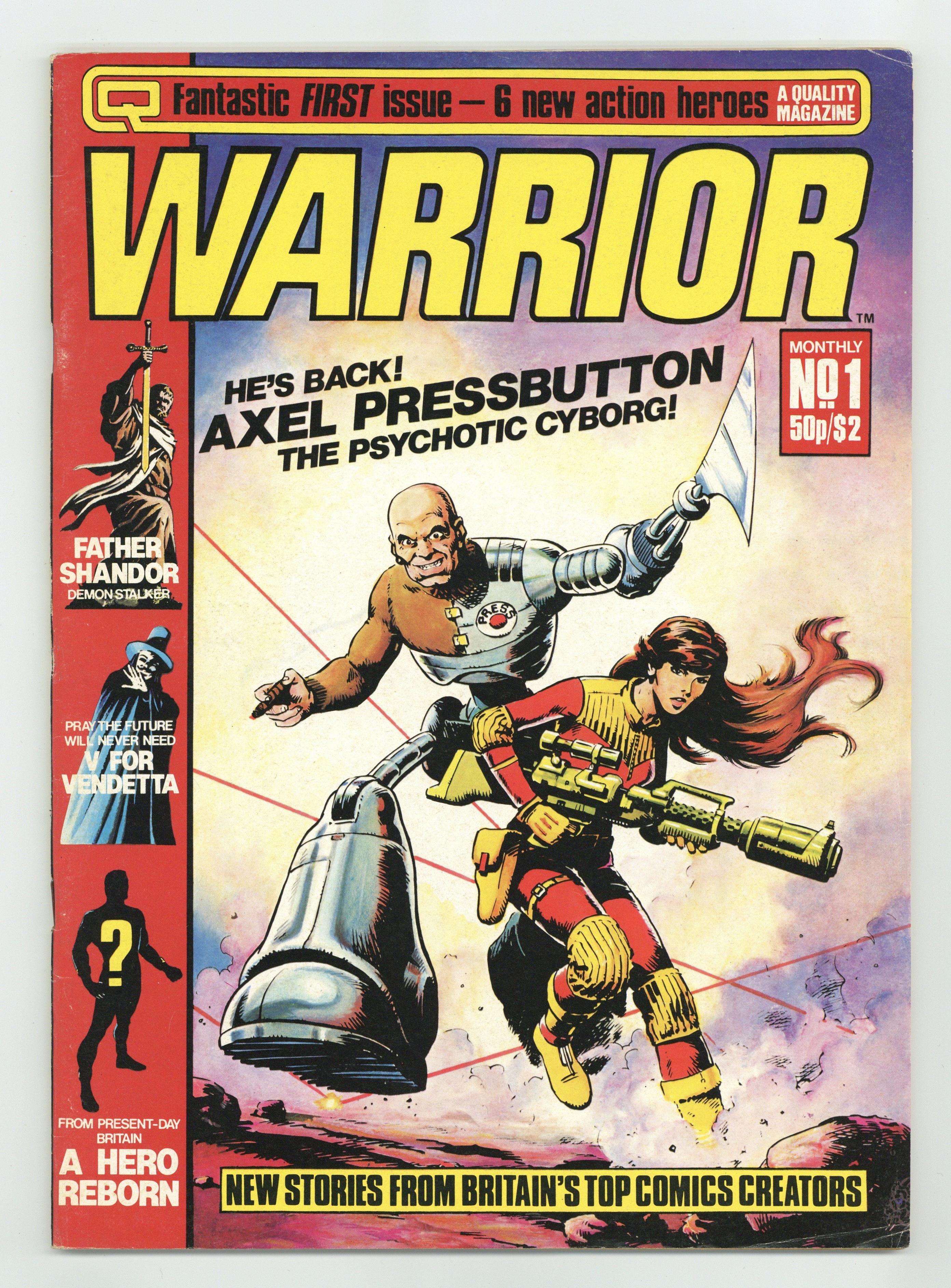 Here it is, the UK comic anthology magazine that started it all. Back in 1982, Warrior hit the newsstands featuring some of the best and brightest of Britain's comic talent, including the first appearance of Alan Moore's MarvelMan, who eventually becomes Miracleman in the U.S. Axel Pressbutton cover by Steve Dillon; "A Dream of Flying" (Marvelman) by Alan Moore & Garry Leach; "The Mightiest Man in the Universe" by Dez Skinn. A look back at Marvelman; "The Spiral Path" by Steve Parkhouse; "A True Story" by Steve Moore and Dave Gibbons; "The Legend of Prester John" by Steve Moore & John Bolton; "V for Vendetta" by Alan Moore and David Lloyd; "Father Shandor, Demon Stalker" by Steve Moore & John Bolton; "Laser Eraser & Pressbutton" by Pedro Henry & Steve Dillon; "Warriors All" a look at the creative talent from this issue.