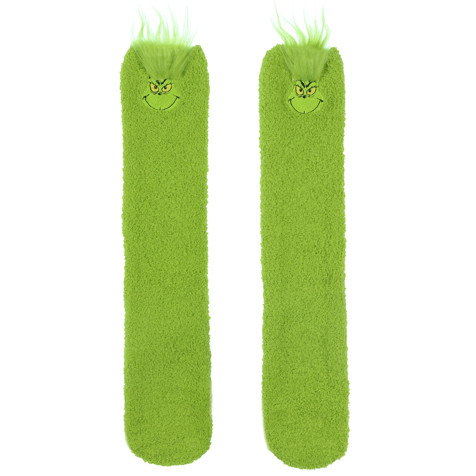 These Dr. Seuss The Grinch "Always Naughty" knee-high slipper socks combine playful style with everyday comfort. Featuring an embroidered Grinch face near the knee topped with fuzzy hair accents, these socks showcase a bold green and black color scheme and textured rubber grips on the soles in heart shapes with the playful text “Always Naughty.” Made from a soft blend of 98% polyester and 2% spandex, they offer a cozy, stretchy fit that hugs the legs and keeps them warm. The tall knee-high length provides extra coverage, making them both functional and fun. The anti-slip bottoms help with traction on smooth floors, while the easy-care, machine washable fabric simplifies upkeep. One size fits most teens and adults, making these versatile for lounging, relaxing, or adding personality to your at-home wardrobe.