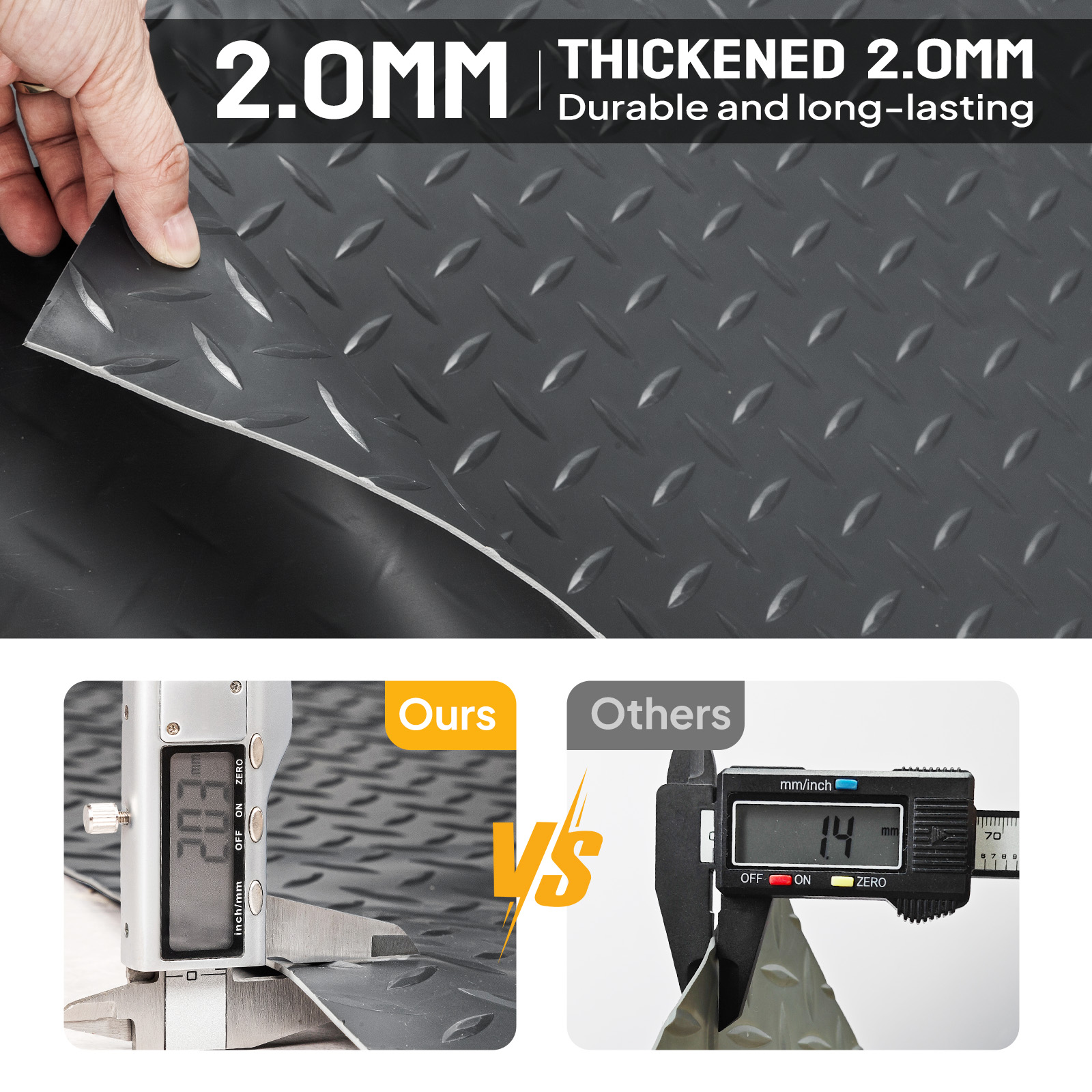Diamond pattern provides traction to help prevent slips. Made of PVC, durable and wear resistant, can support long-time standing and withstand vehicle-grade loads like trailers, trucks, or SUVs without deforming.