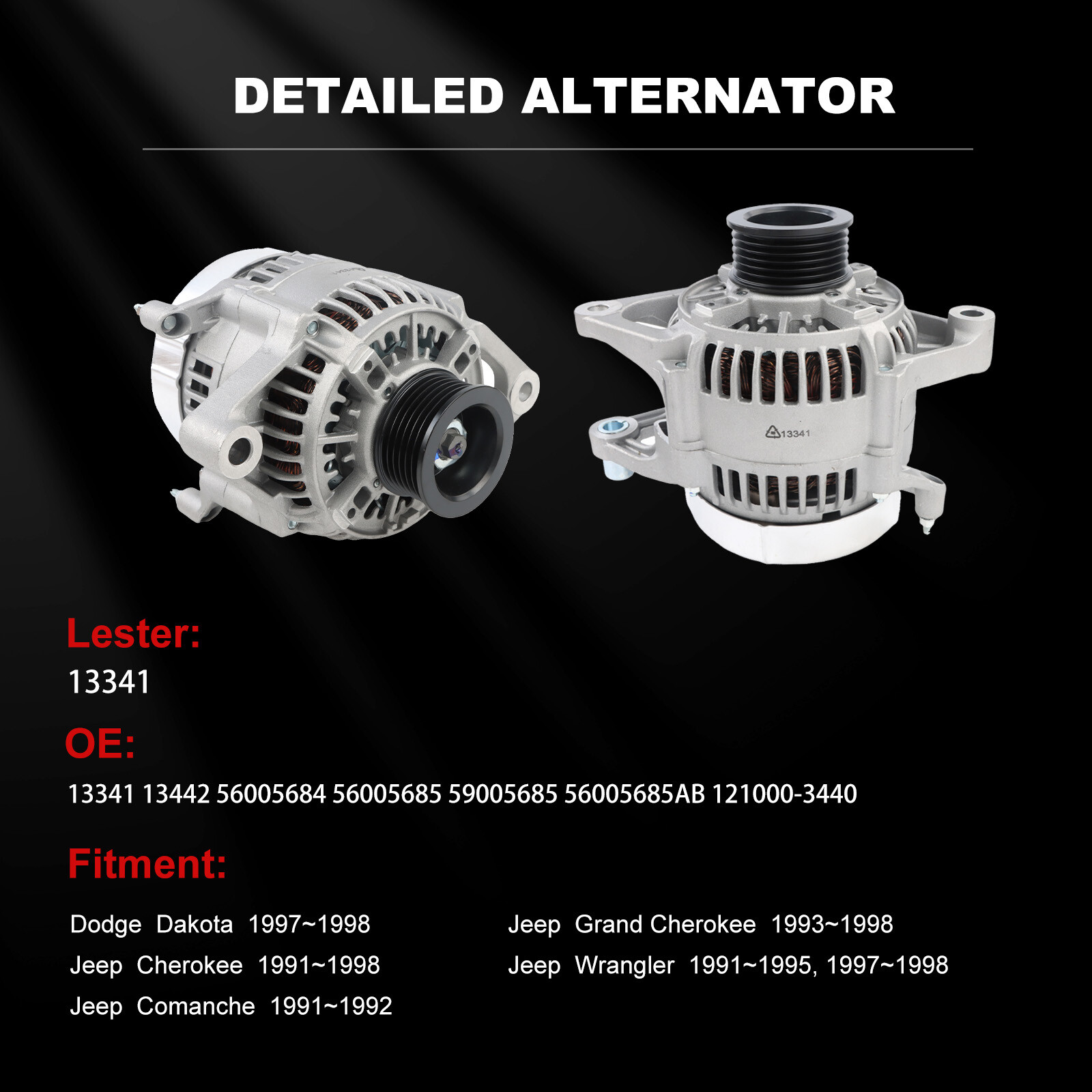 Length(cm): 27, width(cm): 21.5, height(cm): 20 Weight(kg): 4.5 Material: Aluminum Color: Aluminum Placement on Vehicle: Front Voltage: 12 Amperage: 90 Rotation: CW Pulley Groove Quantity: 6 Fan Type: IF 13341 13442 56005684 56005685 59005685 56005685AB 121000-3440 Dodge Dakota 1997~1998 100% computerized load and power testing for reliability, durability and performance. [Specifications]: When your vehicle stalling engine, sudden dashboard warning lights or failing electrical systems, our brand new alternator is a good choice for you to solve these problems. High output alternator provide electricity to the vehicle and recharge the battery. Die-cast aluminum alternator, Pure copper winding, external insulating coating to prevent short circuit, stable and strong power for vehicle Alternator comes with a 1-Year Unlimited-Mileage Warranty; Being brand-new and sturdy, this Alternator is the ideal choice for direct replacement. We extremely value your satisfaction and strive to provide you good shopping experience. Alternators feature high-quality bearings with high-temp lubricant and double-lip rubber seals to reduce friction, vibration and noise; Rotors and stators calibrated and then sealed with secondary insulating coating to help prevent shorts. Our alternator provides protection from excessive charging or failure due to shorts in your car's wiring that can cause spikes or open circuits. 1 year warrantySpecifications
