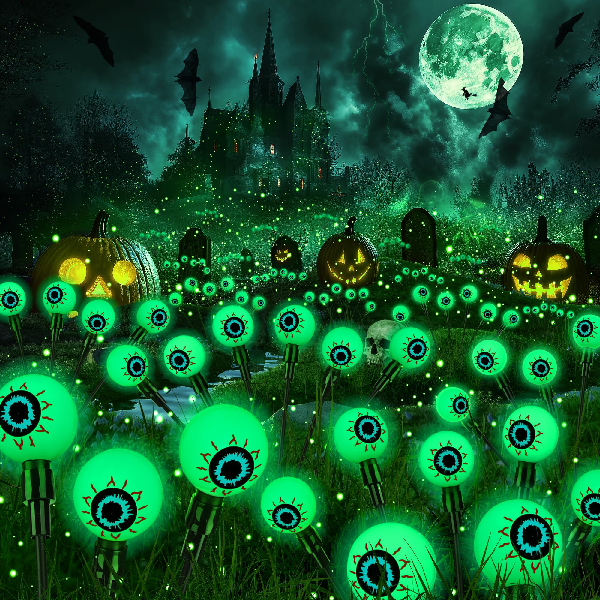 Scary Halloween Eyeball Lights: Featuring 3D designs and swaying eyeballs for an ultra-realistic, lifelike effect. The bloodshot green eyes, paired with an eerie glow, instantly create a chilling atmosphere. Light up your Halloween with these creepy flickering eyeball lights—perfect for giving your neighbors and passersby a fright
