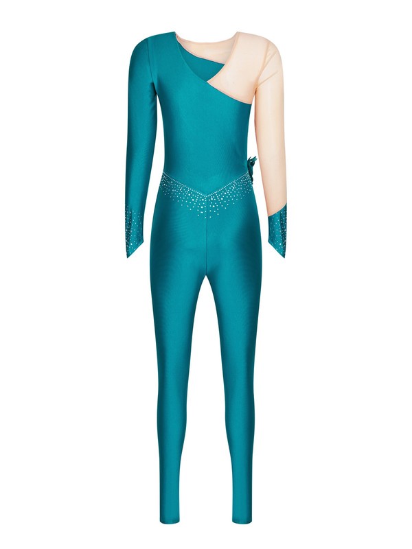 Made from a blend of polyester and spandex, the jumpsuit is stretchy and comfortable, allowing for a full range of motion during figure skating or gymnastics.