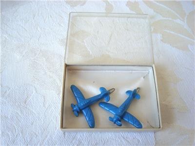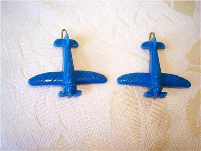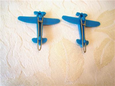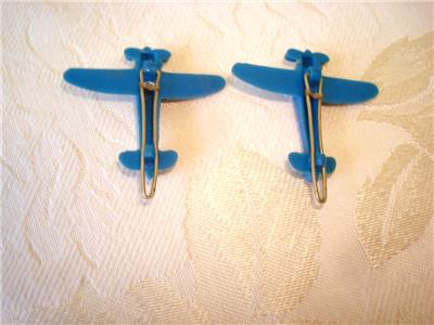 A pair of blue plastic WWII fighter plane barettes measuring about 1 3/8 x 1 5/8 inches; they are in very good vintage condition. Be sure to take a look at our other listings, we are always happy to offer combined shipping discounts. International Buyers - Please Note: Import duties, taxes, and fees are the buyers responsibility, these charges are not included in the item price or shipping cost. The charges are the buyer's responsibility. Please check with your country's customs office to determine what these charges will be prior to bidding or buying.
