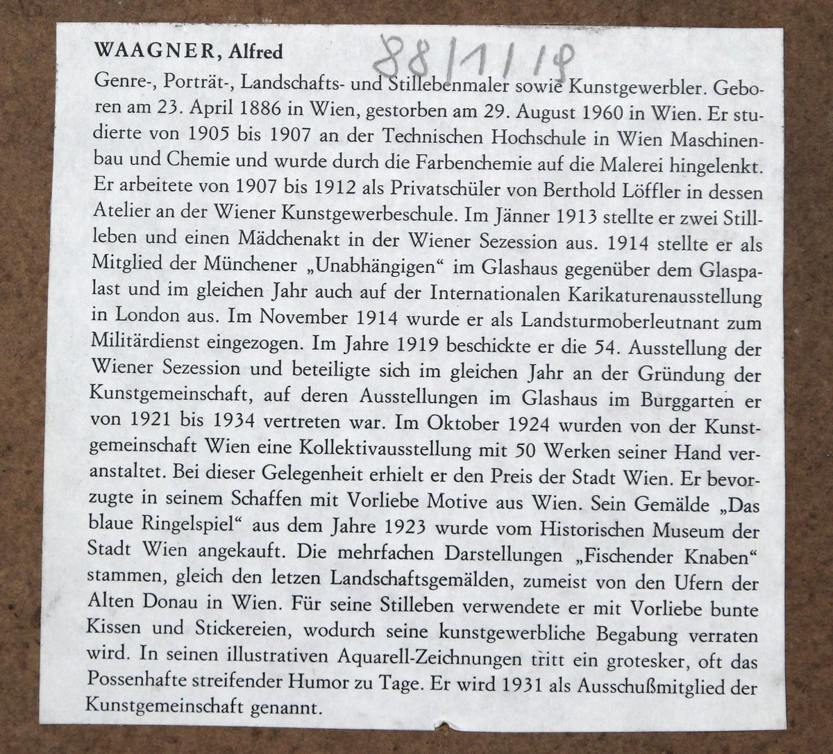 Alfred Waagner (1886-1960) österreichischer Maler und Kunstgewerbler des Jugendstils.1907 bis 1912 Privatschüler bei Bertold Löffler . 1913 stellte Waagner in der Wiener Secession, 1914 im Glaspalast in München sowie in London aus. Von 1914 bis 1918 nahm Waagner am Ersten Weltkrieg teil. Er kehrte im Dezember 1918 in seine Heimat zurück und beteiligte sich 1919 an der 54. Ausstellung der Wiener Secession. Im selben Jahr war er auch an der Gründung der Kunstgemeinschaft beteiligt, deren Ausstellungen er viele Jahre lang beschickte. [] Viele seiner Bilder kamen nach der Auflösung der Sammlung seines Freundes Jürgen Schmidt in den Kunsthandel. Seine Gemälde zeigen oft eine Verwandtschaft mit Werken Klimts;eine allegorische Darstellung von Jugend und Tod[].