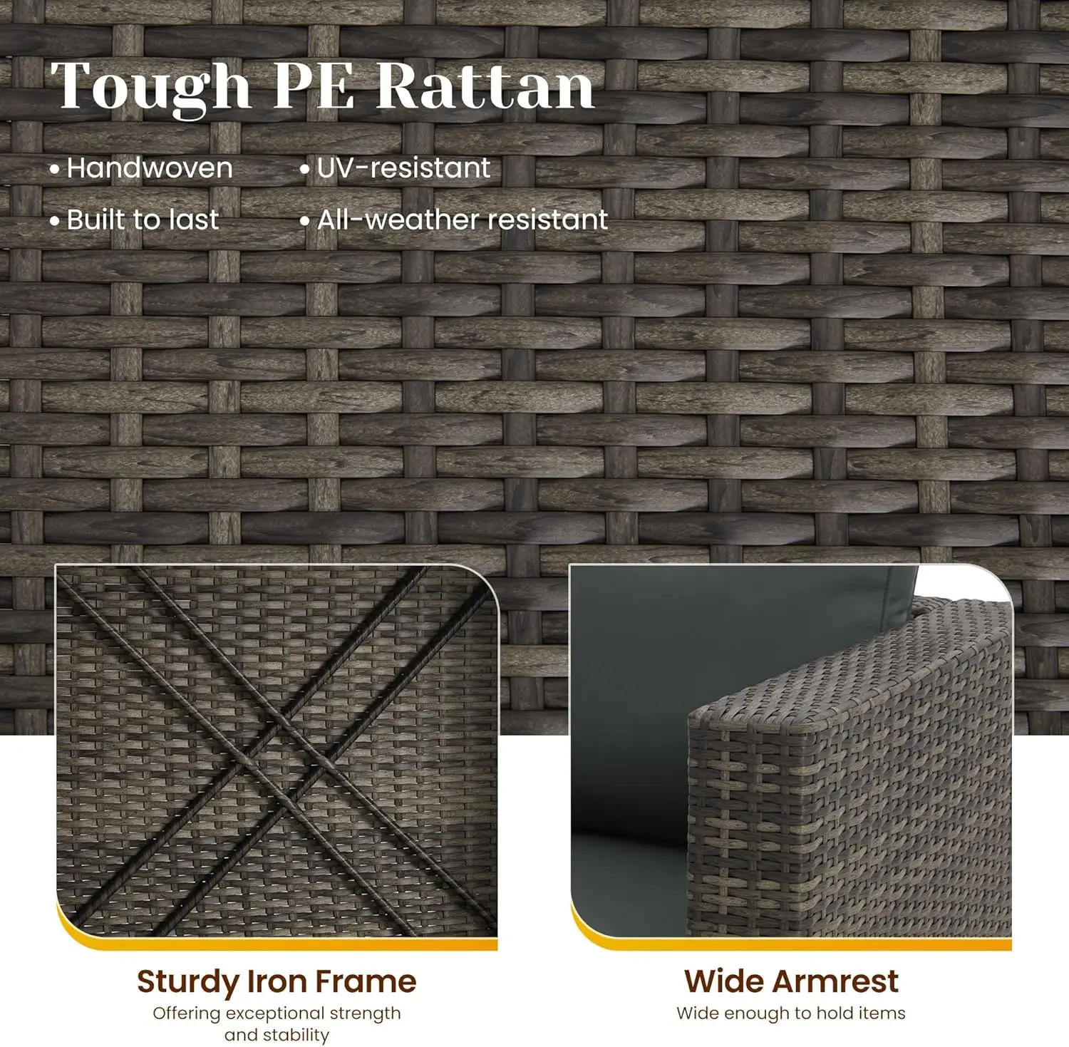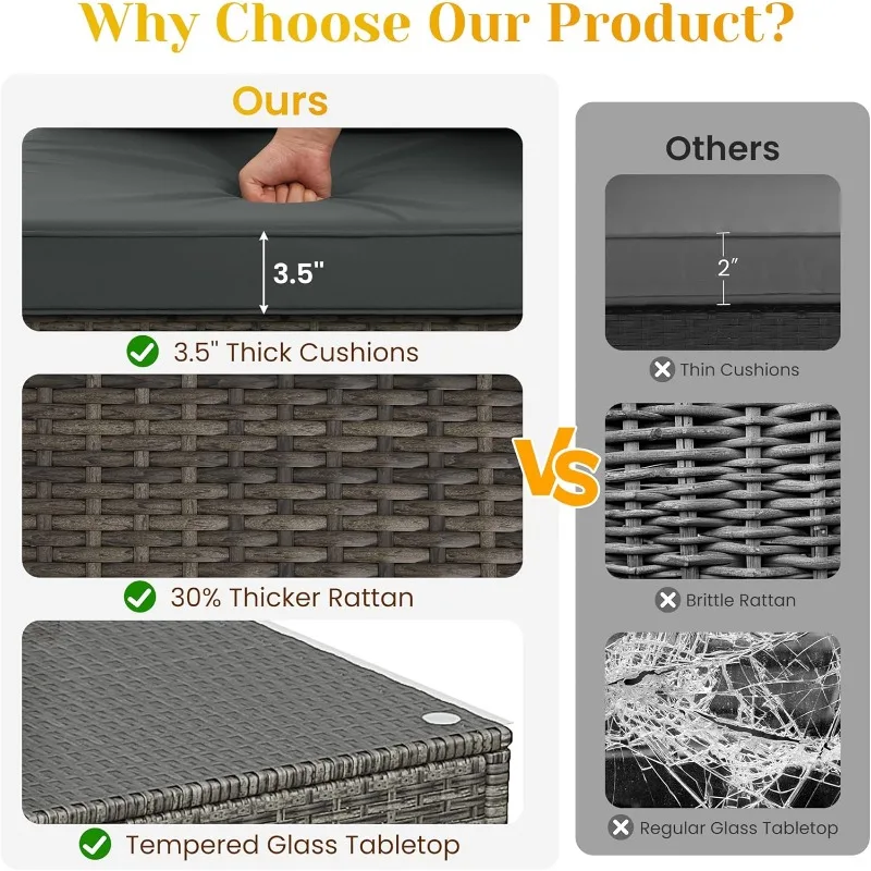 【Easy Assembly & Clean】With detailed product instruction, you can assemble the 5 piece wicker outdoor patio furniture set quickly. The zippered cushion covers of the sectional sofa are detachable and washable, and the PE rattan surface is smooth, which offers convenience for you to clean.