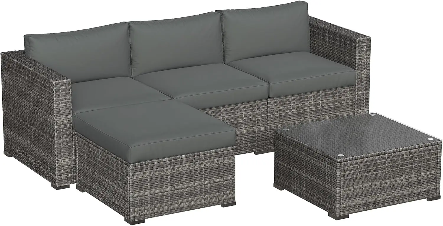 5 Piece Outdoor Patio Sectional Furniture Set, Weather Resistant Rattan Outside Couch, Waterproof Conversation Sofa for Balcony, Porch, Backyard, Deck, Garden, Grey