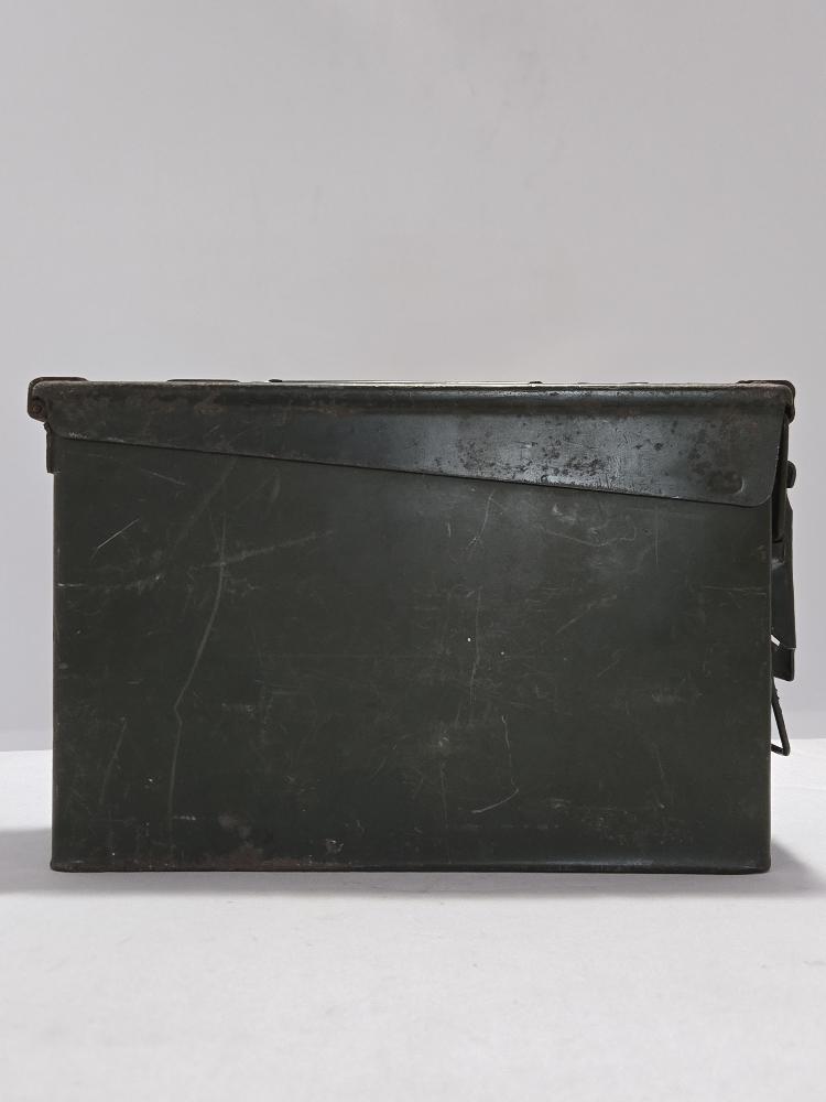 This steel ammo can features a hinged lid with latch closure and a carry handle for easy transport. These containers are commonly used for ammunition storage, tools, hardware, emergency kits, or general storage.