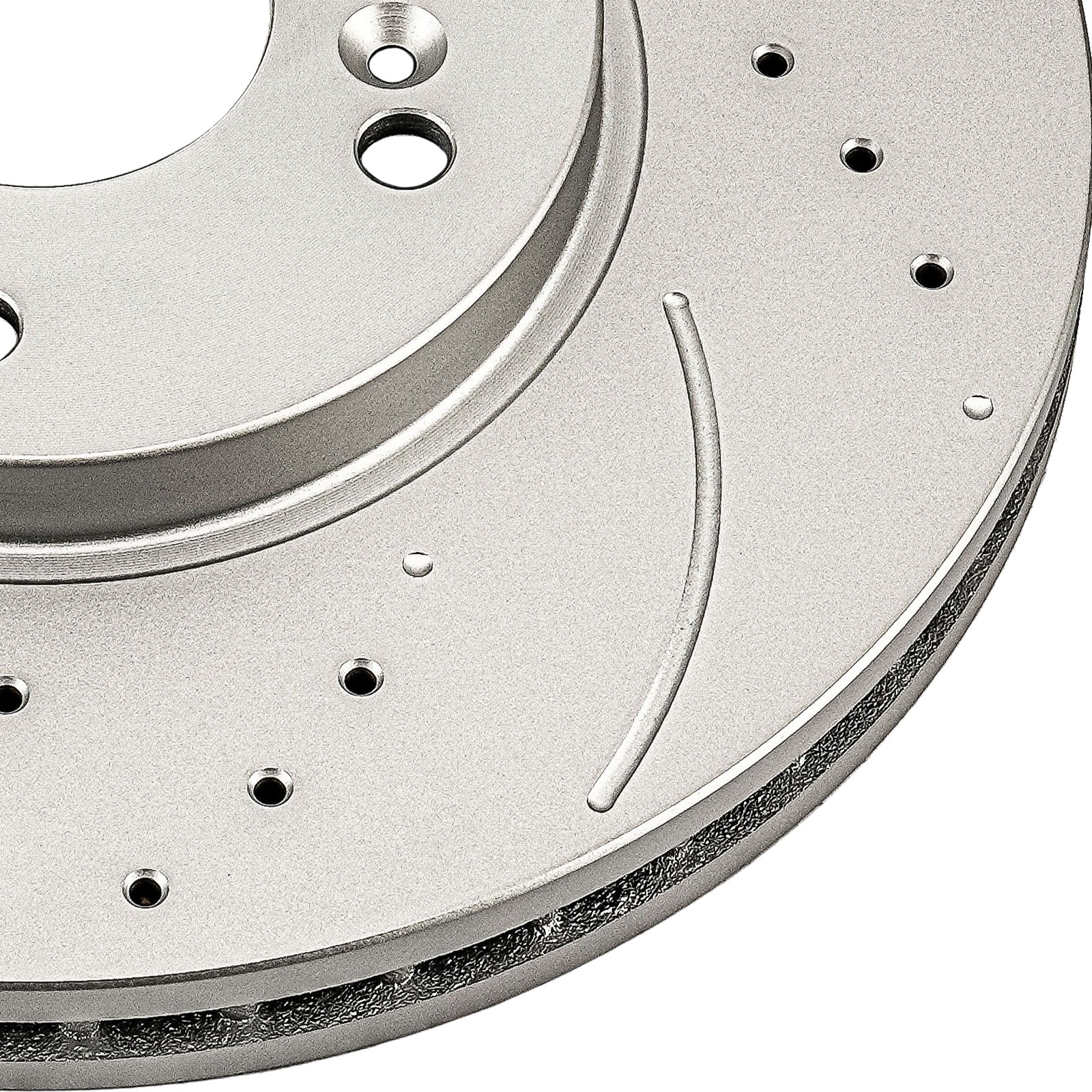 - The kit includes vented, drilled, and slotted brake rotors that provide effective heat dissipation for enhanced braking efficiency.