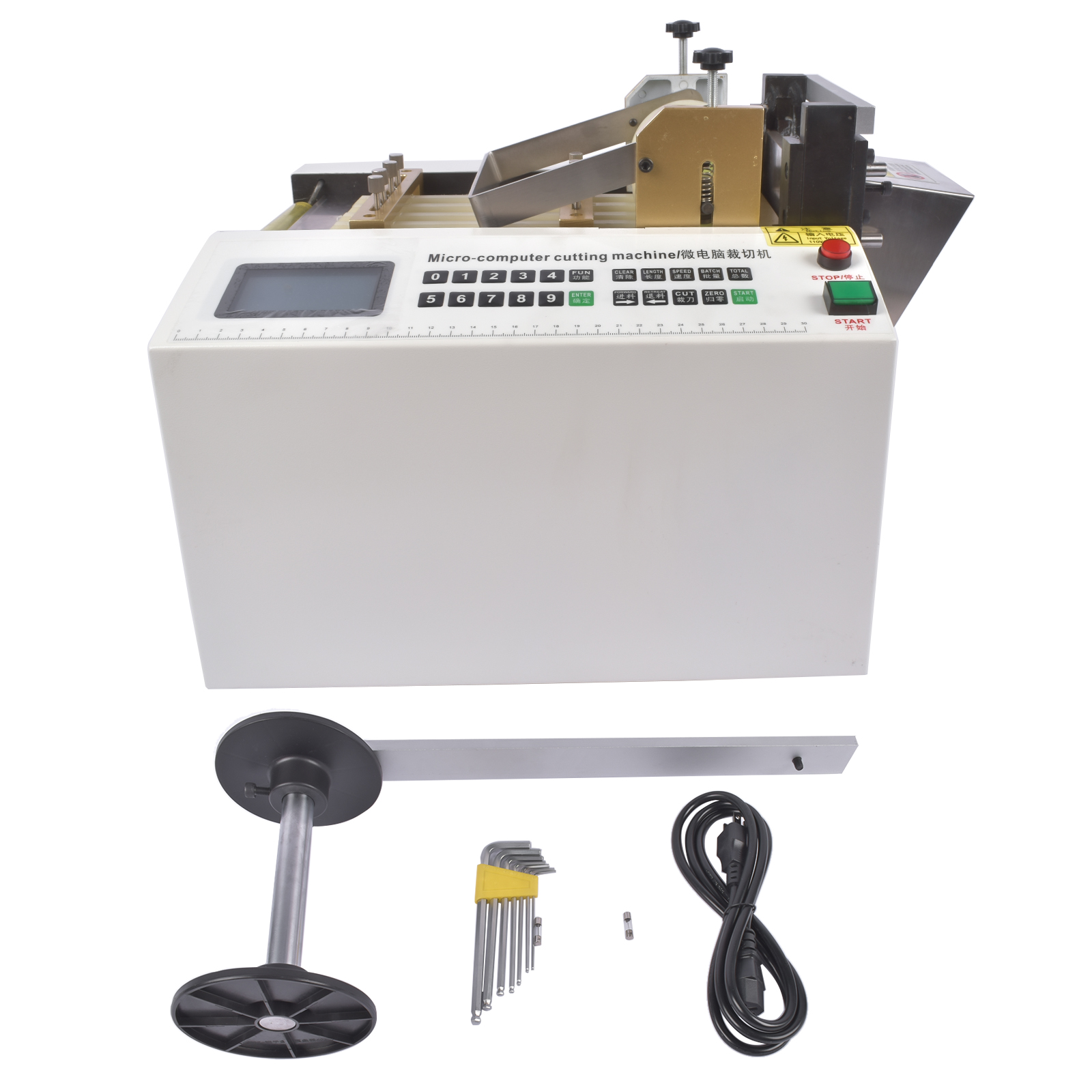 Efficient & Precise Cutter: The heat shrink tube cutter has a cold cutting function. It features the synchronous cutting of 3 tapes. Cutting length: 0.1-9999.9 mm; Cutting width: 4"/100 mm; Max cutting diameter: 1/2". With a white steel welding knife and a high-strength feed drum, the cutting is efficient.