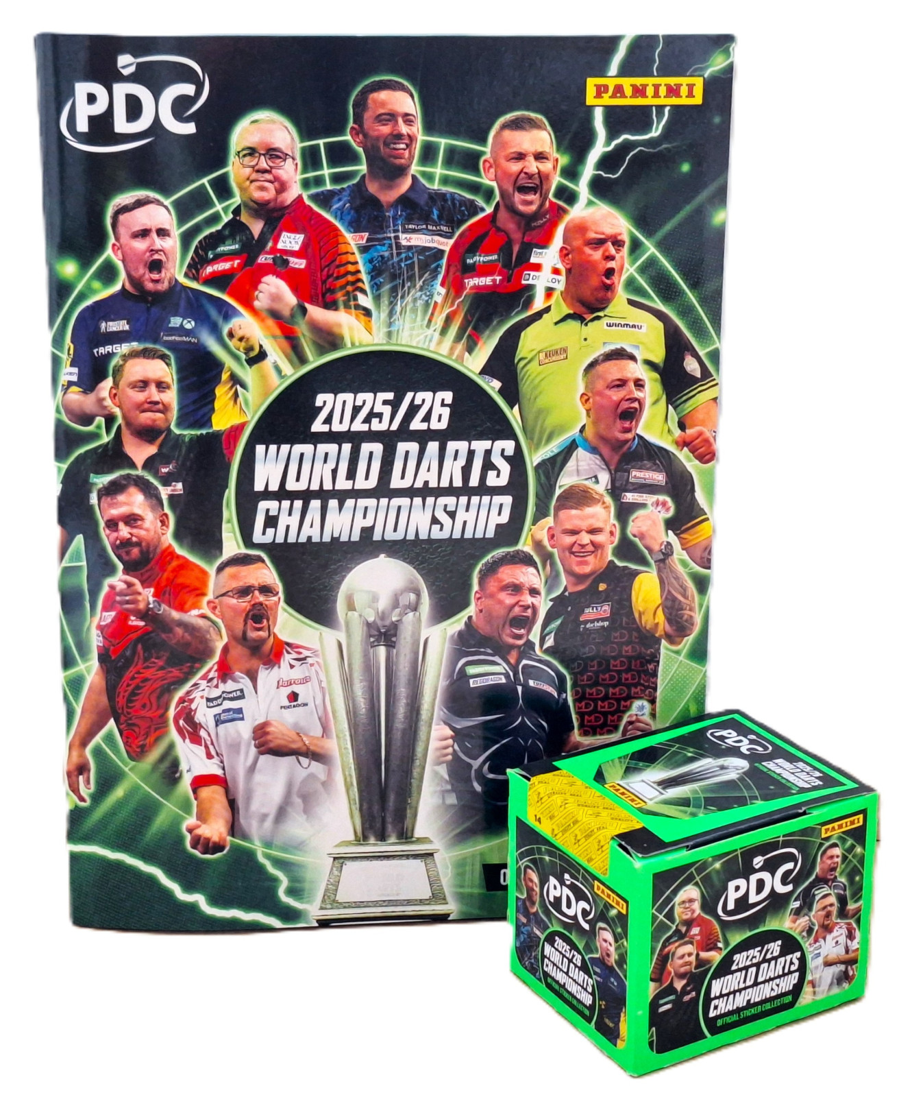 Die Panini PDC World Darts Championship 2025/26 Stickerkollektion ist ein Muss für jeden echten Darts-Fan: 312 Sticker, davon 96 Special-Sticker mit glänzenden Effekten, besonderen Materialien und den kultigen Kiss-Cut-Stickern in Flight-Form.