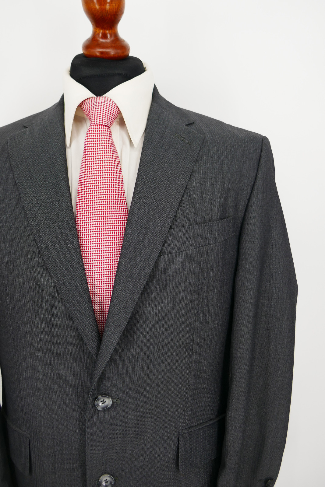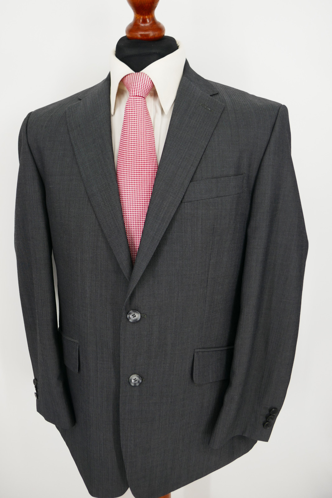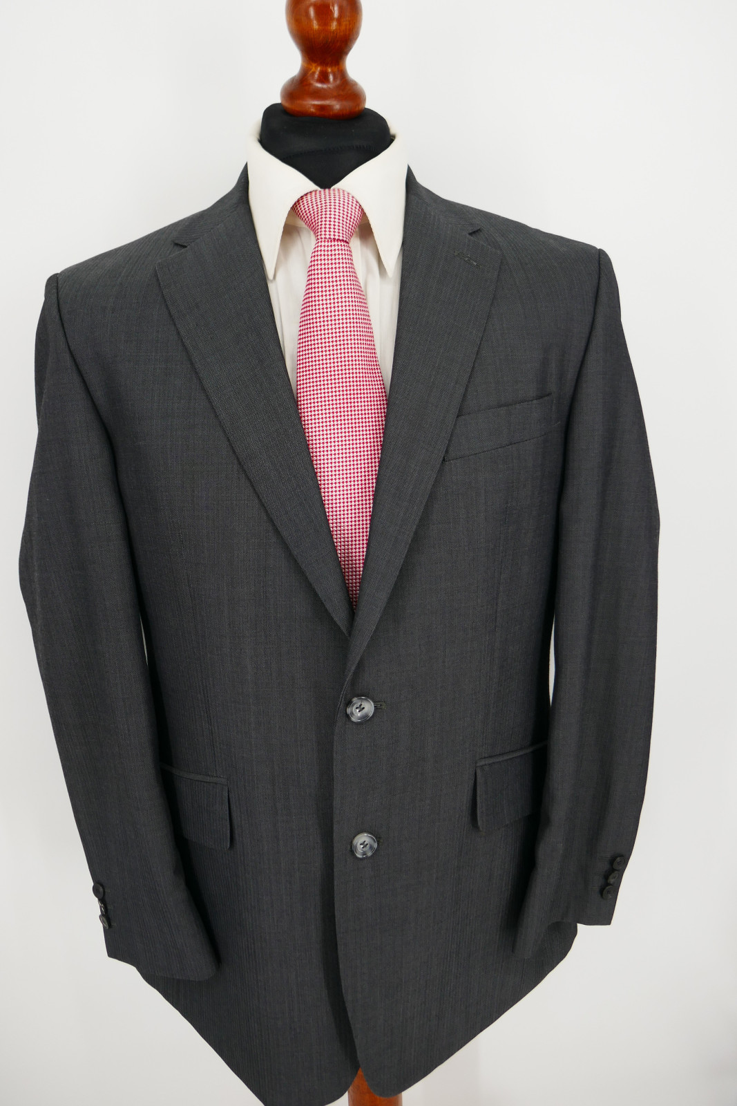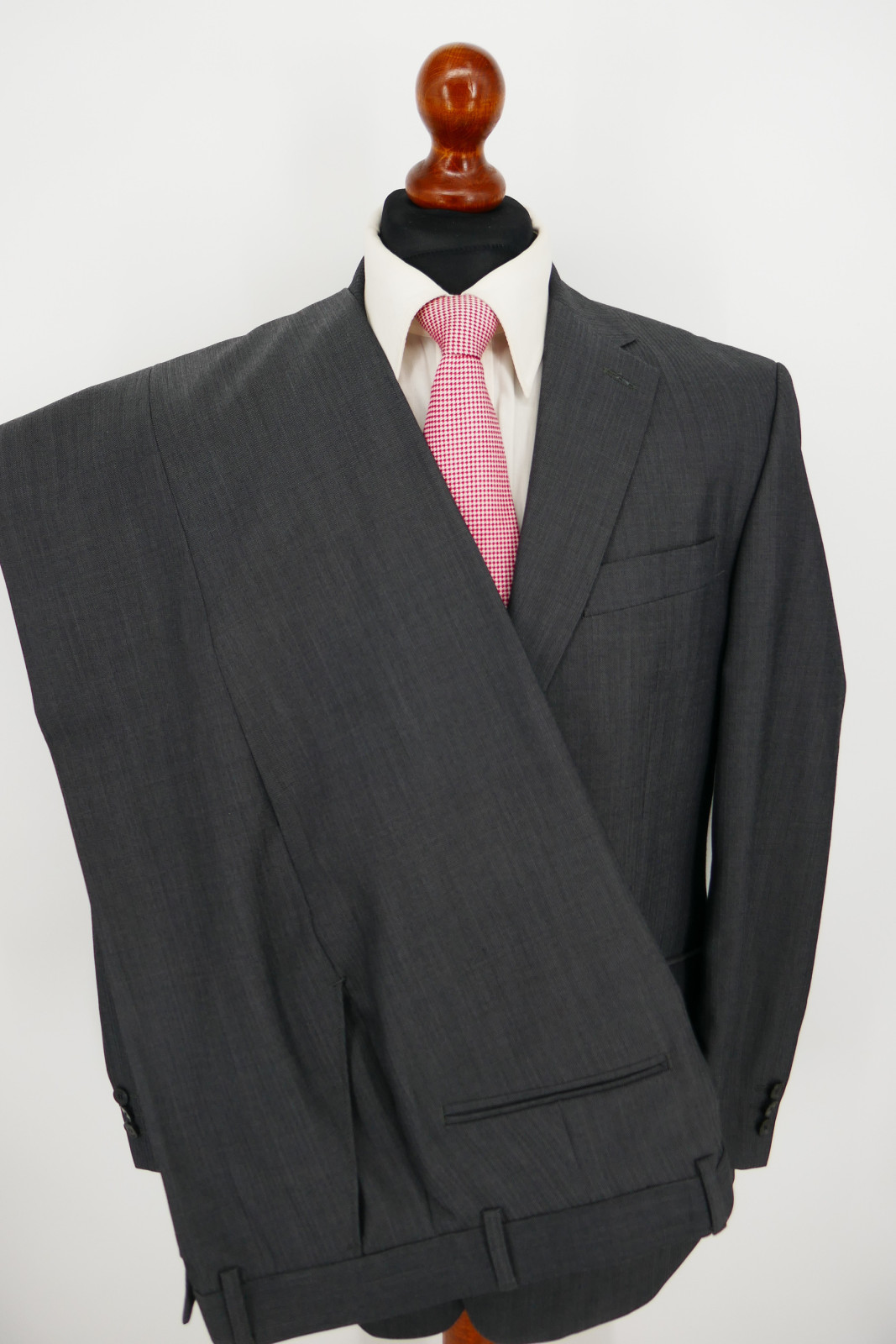 Das Sakko ist ein Einreiher. Es ist mit zwei Verschlussknöpfen und doppeltem Gehschlitz ausgestattet. Die Hose ist normal und gerade geschnitten, und ohne Bundfalten versehen. Hose mit 2 Seiten- und 2 Gesäßtaschen. Die Farbe des Anzug ist ein wunderschönes Dunkelanthrazit fein strukturiert, siehe Bilder.