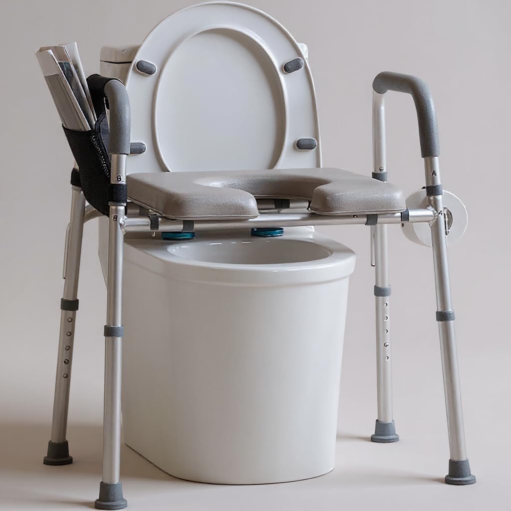 Sedia per WC per anziani con seduta imbottita e braccioli, sedile WC rialzato, regolabile in altezza a 5 livelli, sedile WC portatile, portatile, capace di trasportare, 136 kg, facile da spostare