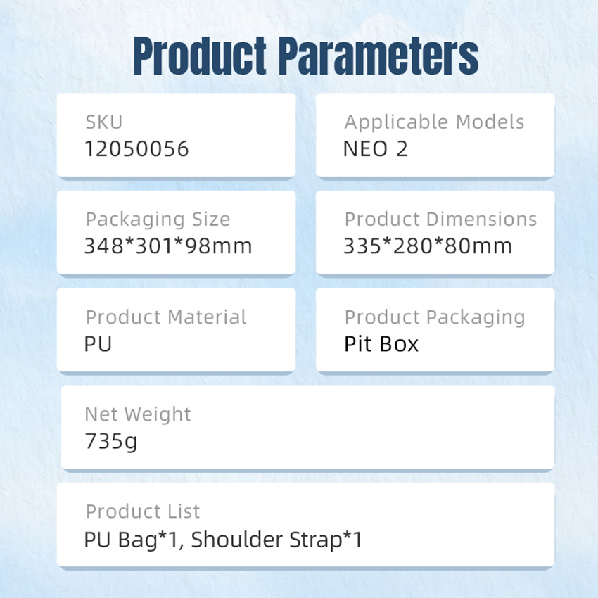l Constructed from premium PU fabric, the outer shell offers pressure resistance, abrasion resistance, and splash protection. The interior features a dual-layer Lycra fabric with shock-absorbing padding that precisely conforms to the body and accessories, effectively securing them to prevent collisions and friction. Withstands compression, ensuring lasting protection for your NEO2 aircraft and related accessories during both transport and storage