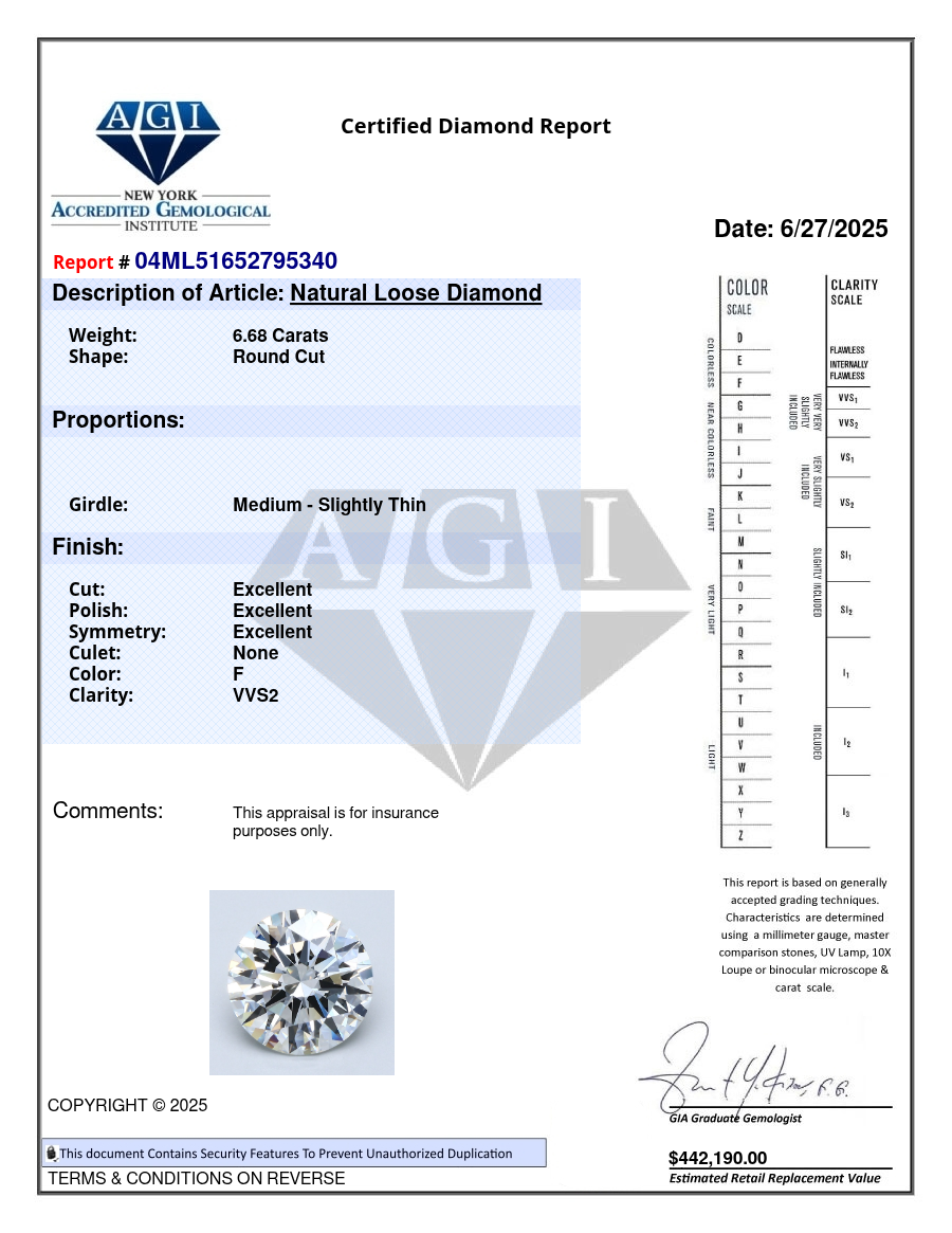 Round Brilliant 6.68 CT Certificate AGI Natural Mined Diamond Loose F color VVS2 clarity
