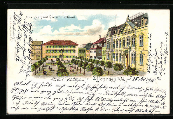 Lithographie Offenbach a. M., Alicenplatz mit Kriegerdenkmal aus der Vogelschau