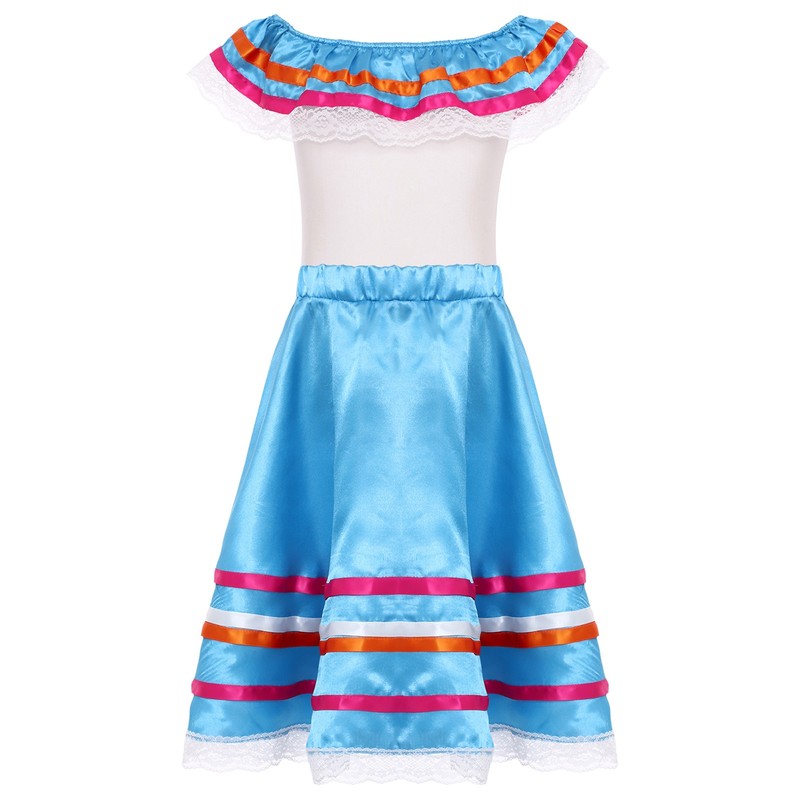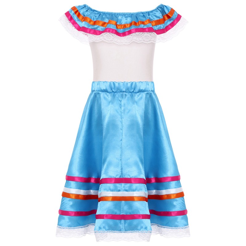 Kids Girls 2 Pieces Costume Mexican Dress Cosplay Ruffled Top With Skirt Retro