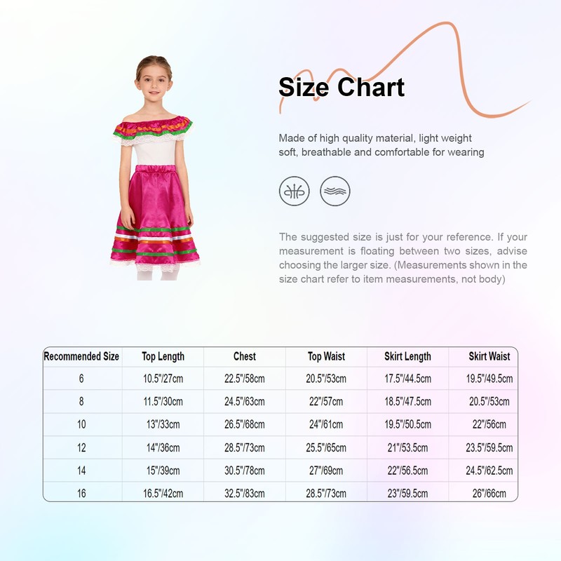 This two-piece Mexican dress outfit is perfect for Mexican themed activities, carnivals, parties, and other festive events, making your little girl the center of attention.