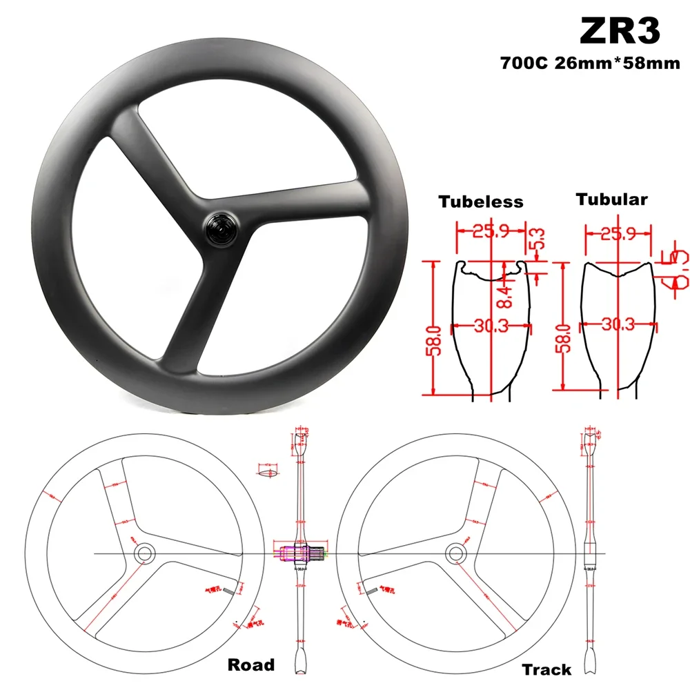 26mm Wide Carbon 3 Spoke Wheels 700c Bicycle Carbon Road/Track/Fixed/ Disc Brake Tri Spoke Wheels