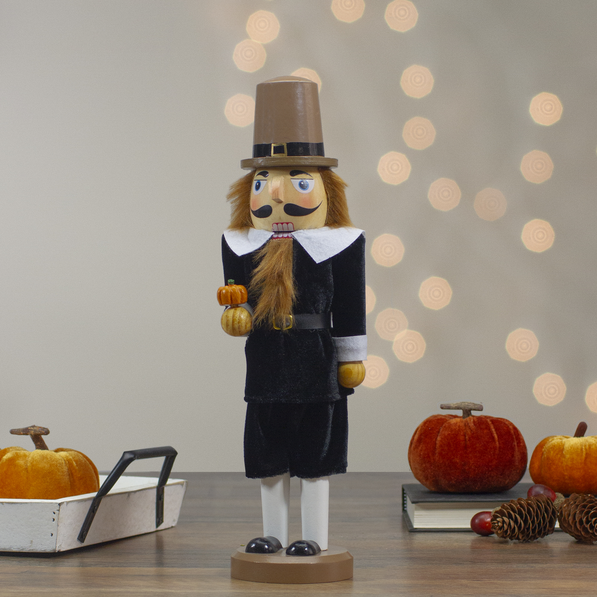 Give your fall décor a traditional touch with this Pilgrim nutcracker, designed to honor the classic style of Thanksgiving. Dressed in a timeless black and white outfit, this Thanksgiving nutcracker captures the look of early colonial attire while standing proudly as a festive seasonal accent. The nutcracker decoration is detailed with a light brown pilgrim hat that complements his ensemble, and he holds a bright orange pumpkin as a symbol of the harvest season. This thoughtful design makes it an ideal piece for anyone looking to highlight the meaning of Thanksgiving through decorative accents. Crafted with quality materials, this pilgrim Thanksgiving nutcracker is both durable and eye-catching, making it a centerpiece for mantels, shelves, or tabletop displays. Its sturdy base allows it to stand securely on flat surfaces, while the finely painted details showcase craftsmanship that will stand out year after year. Perfect for adding seasonal warmth to your home, this Pilgrim nutcracker pairs beautifully with other fall decorations, including gourds, candles, and wreaths. A wonderful collectible for nutcracker enthusiasts or a thoughtful gift for Thanksgiving hosts, it’s a timeless way to highlight holiday tradition.