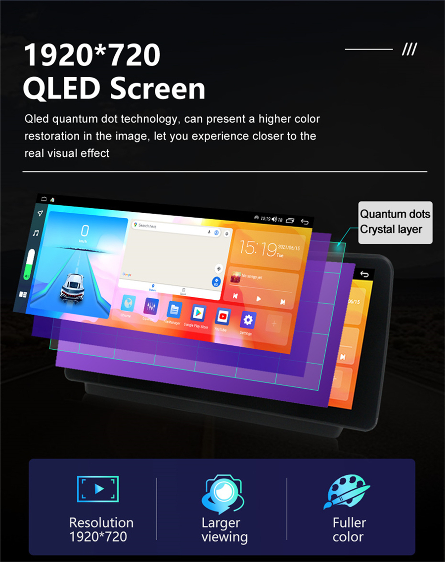 Display | - Touch Screen: Yes - Resolution: QLED 1920*720 - Main Menu Status Bar display: Can be changed to Music/Radio/BT-Stereo Player and Clock/Date/Week - Change Apps-Icon Position: Yes - Picture in picture / split screen:Yes Split screen feature enables you to use two applications at the same time. For example running Navigation with Music Player or Radio with Navigation at the same time. Optimum convenience for both the driver and passengers. |