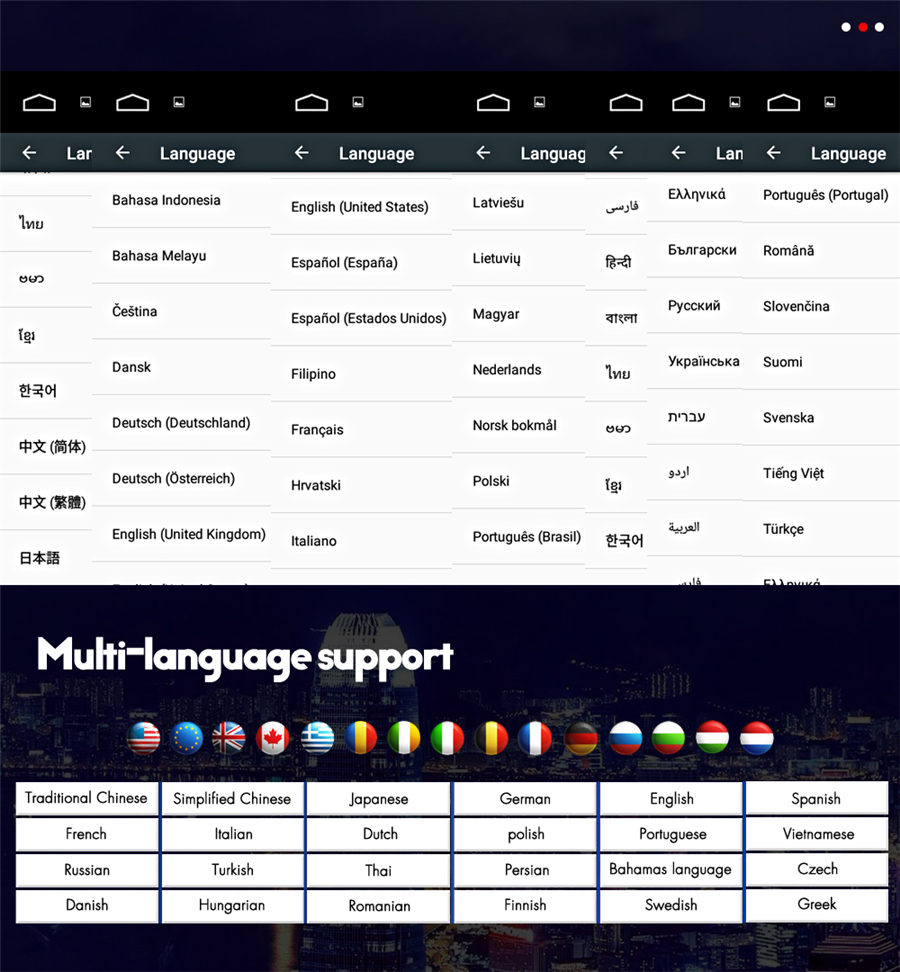 Setup | - WiFi/Hotspot/Bluetooth: Yes - Brightness level adjustable: Yes - Wallpaper: Wallpapers/Live Wallpapers/Gallery - Sound: Key Tone & Volume - Storage: Display Internal Storage/Nand Flash/Connected Device Storage - Apps: Running Apps display/force stop/uninstall - Security: Yes - Accounts: Yes - Languages and Input: more than 70 Languages and choose input method - Backup and Reset: Yes - Date and Time: Setting Date&Time by yourself or choose GPS/network-provided time - Accessibility: Yes - GPS: Yes, GPS application options/monitoring/sound mode/mixing ratio - Driving safety: Watching Video, Reversing X-mirror/Volume, Reversing Trajectory/radar Display, Rear view ruler - Amplifier: Rock/Pop/Jazz/Classic/Flat/Voice/Custom - Steering Wheel Control: Yes - About Device: Display Parameter Info. |