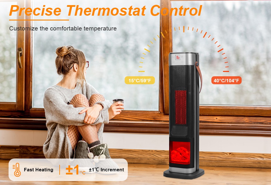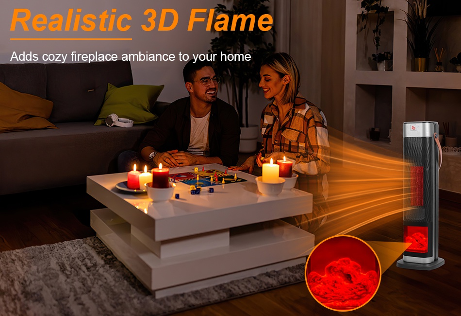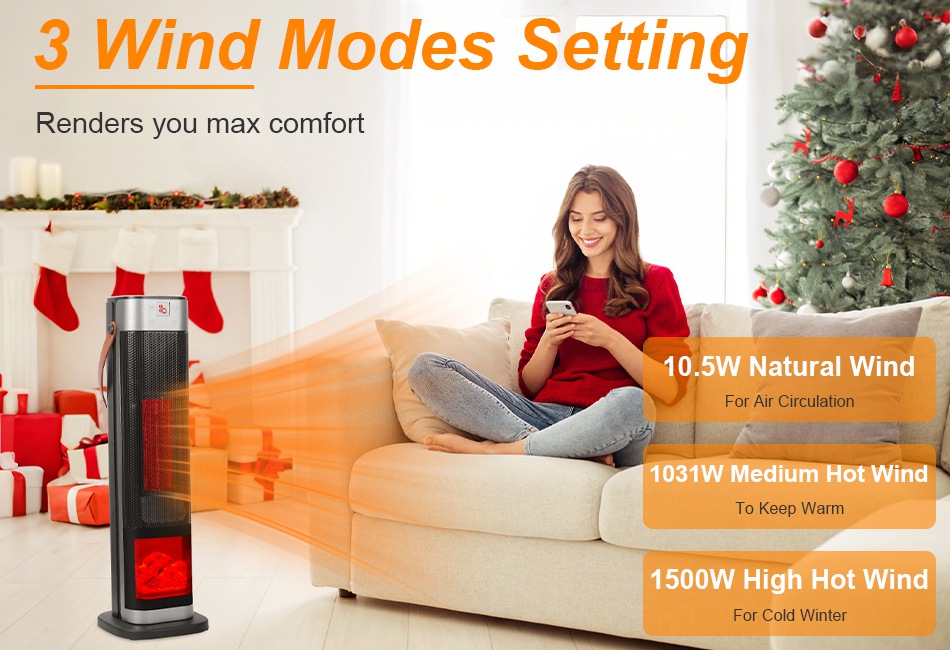 Experience whole-room warmth faster and smarter with our oscillating heater, featuring a 90° wide-angle heat distribution that covers up to 323 sq.ft. Customize your environment with 1℃-adjustable thermostat control from 15℃/59°F to 40℃/104℉ and three wind modes—use it as a heater or a fan year-round. Operate it effortlessly via remote, set the 1-12-hour timer for automated comfort, and sleep soundly thanks to safety protections including overheat and tip-over shutoff. Portable strap handle allows for easy carrying and moving. All this, plus a relaxing 3D flame effect, brings cozy and safe warmth to any room—without the hazard of a real fire.