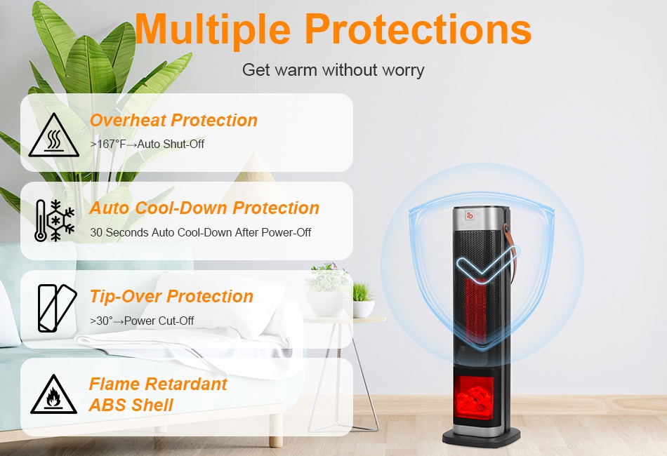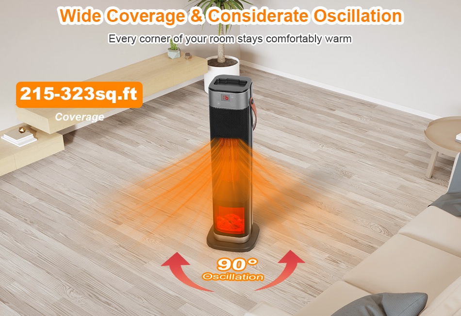- Wide Coverage & Considerate Oscillation:Enjoy 90° wide-angle oscillation that spreads warmth 30% faster than stationary heaters,efficiently covering areas up to 323 sq.ft. Every corner of your room stays comfortably warm. The realistic 3D flame effect adds cozy fireplace ambiance--without any real fire hazards.