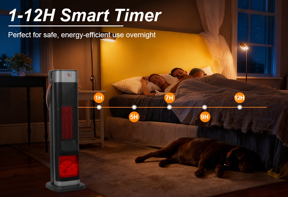 - 12-Hour Timer:Set the heater to run for 1-12 hours based on your routine. It automatically turns off once the desired temperature or set time is reached--perfect for safe,energy-efficient use overnight.