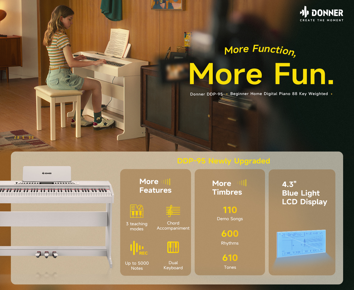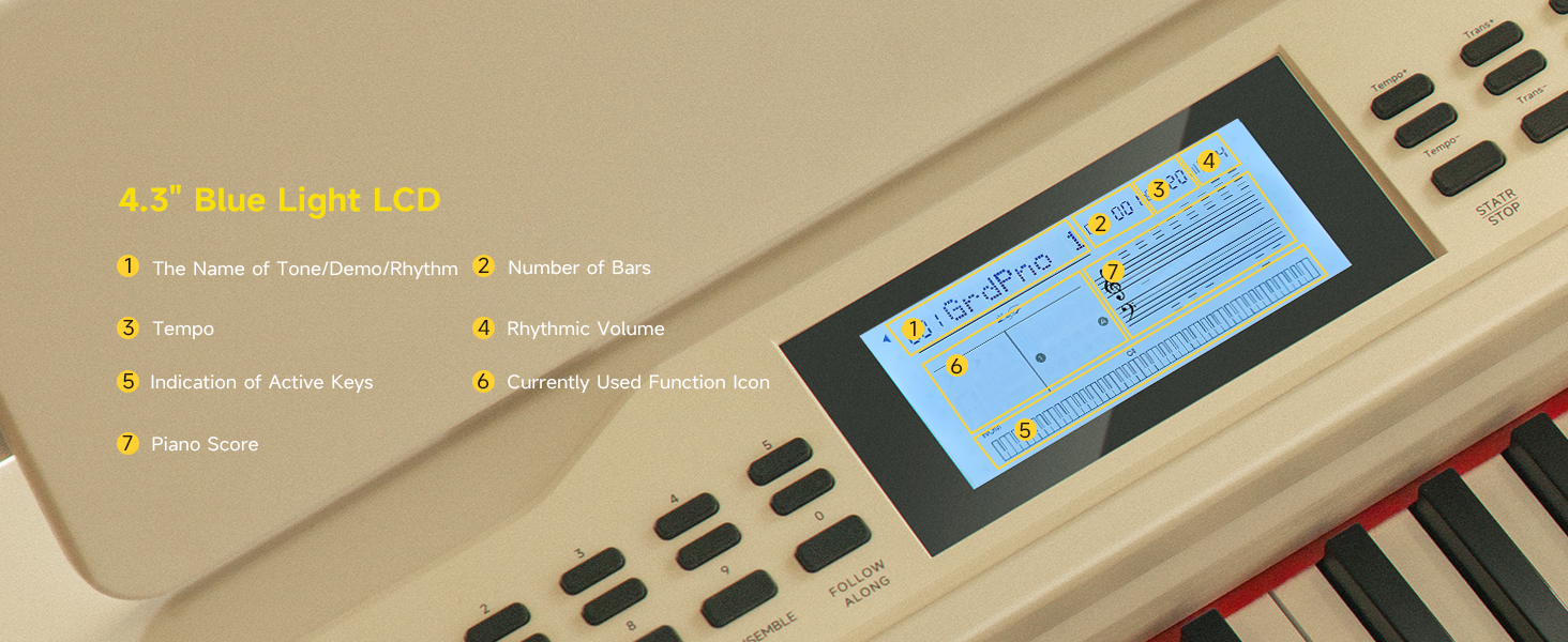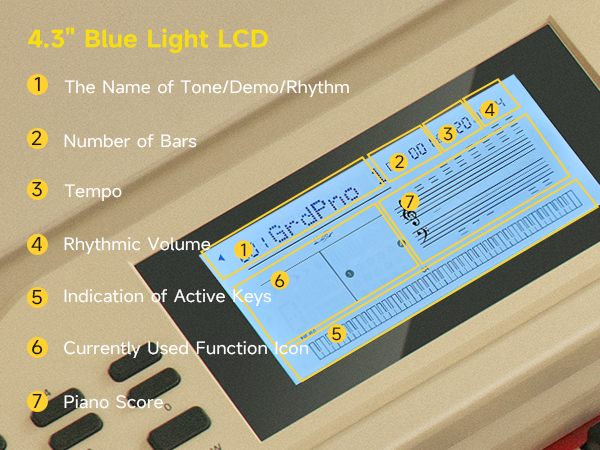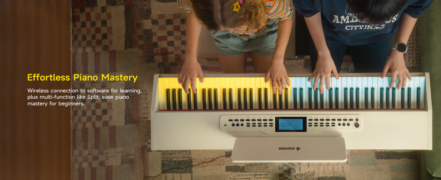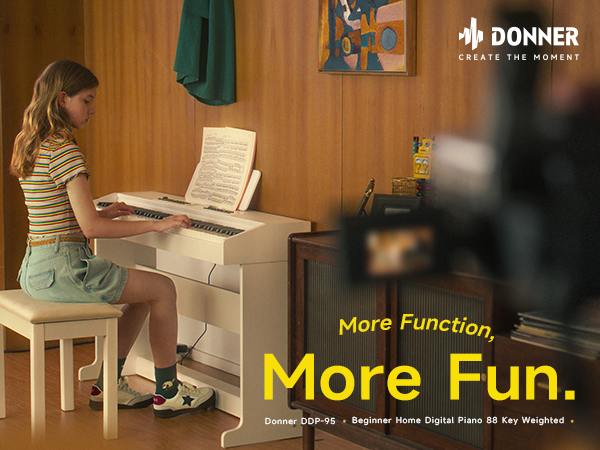 OVERSIZED BLUE LIGHT LCD: The Donner DDP-95 88-key digital piano features a 4.3" LCD display that clearly presents notes in staff notation, indicates key positions, and provides intuitive prompts. This simplifies operation for both seamless professional performances and daily practice