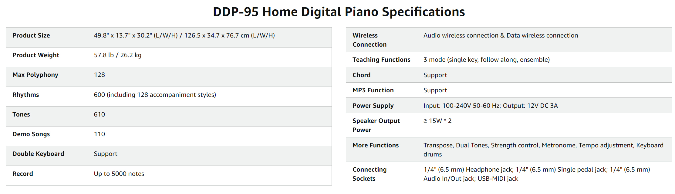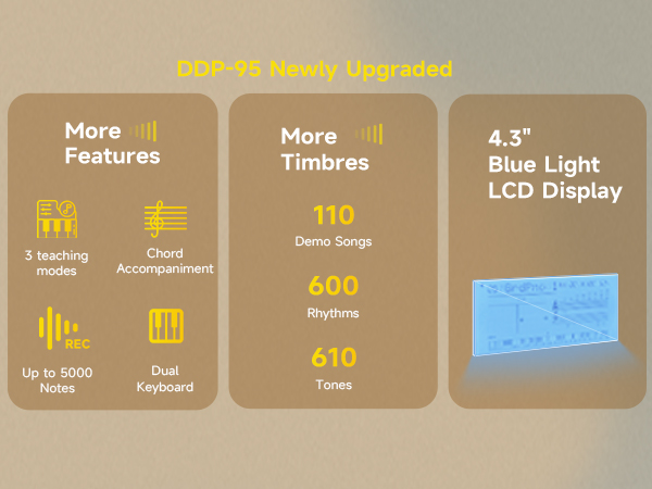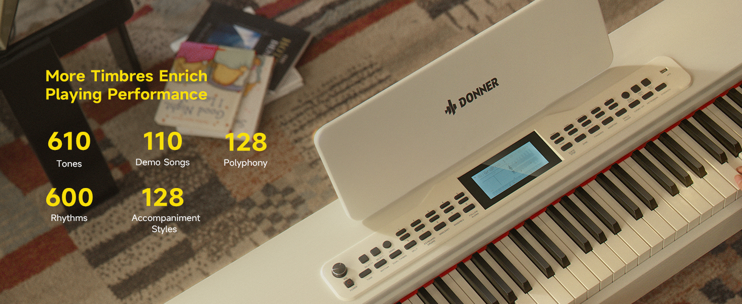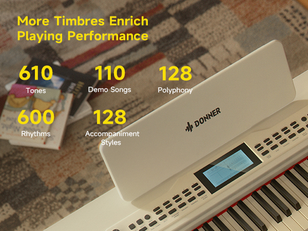 DIVERSE TONE & RHYTHM LIBRARY: DDP-95 electric piano boasts 610 tones, 100 demo songs, & 600 rhythms (128 accompaniment styles), unleashing limitless musical creativity. Ideal for solos, accompaniments, or spontaneous creations, inspiring endless inspiration