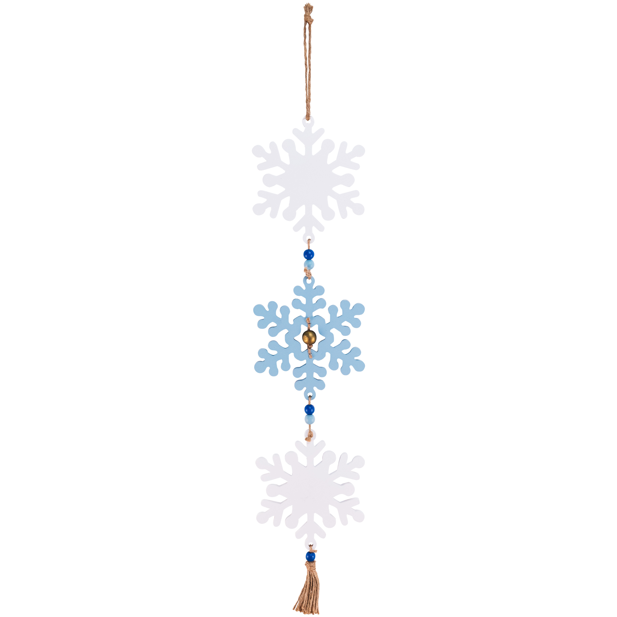 Add a touch of festive charm to your holiday décor with this delightful Christmas wall sign. Three snowflakes spell out "Joy," with the middle snowflake glittered in blue and featuring a gold bead as the "O." Each snowflake is securely attached to a rustic jute rope, adorned with blue wooden bead accents. Perfect for adding a cozy, seasonal vibe to any room, this sign is a simple yet eye-catching way to celebrate the spirit of Christmas.