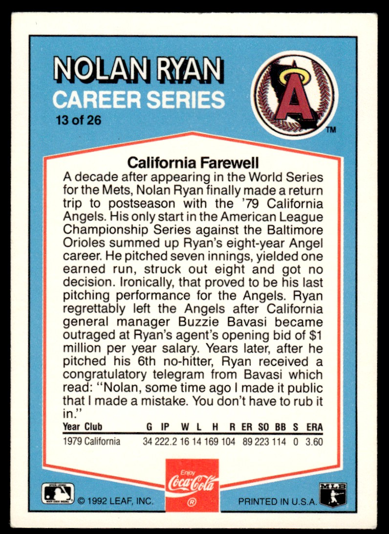 | 1992 Donruss Coca-Cola Nolan Ryan Nolan Ryan California Angels #13 |
