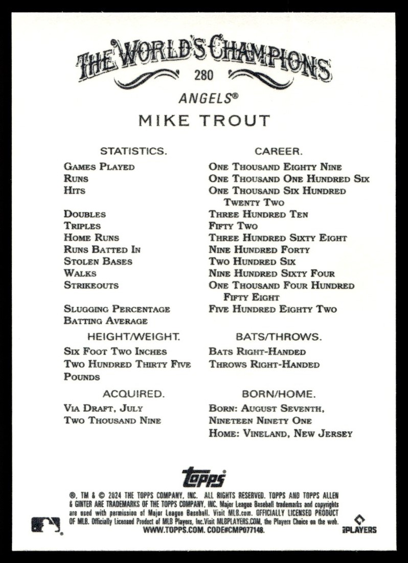 | 2024 Topps Allen & Ginter Mike Trout Los Angeles Angels #280 |