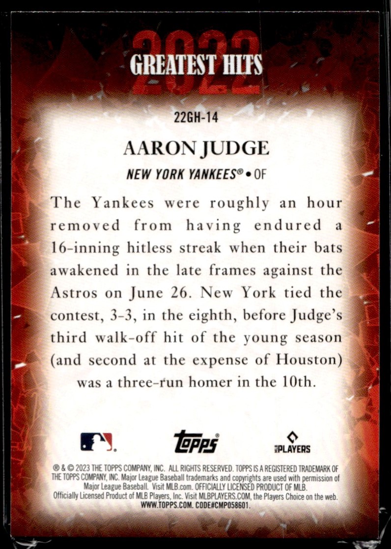 | 2023 Topps Greatest Hits Aaron Judge New York Yankees #22GH-14 |