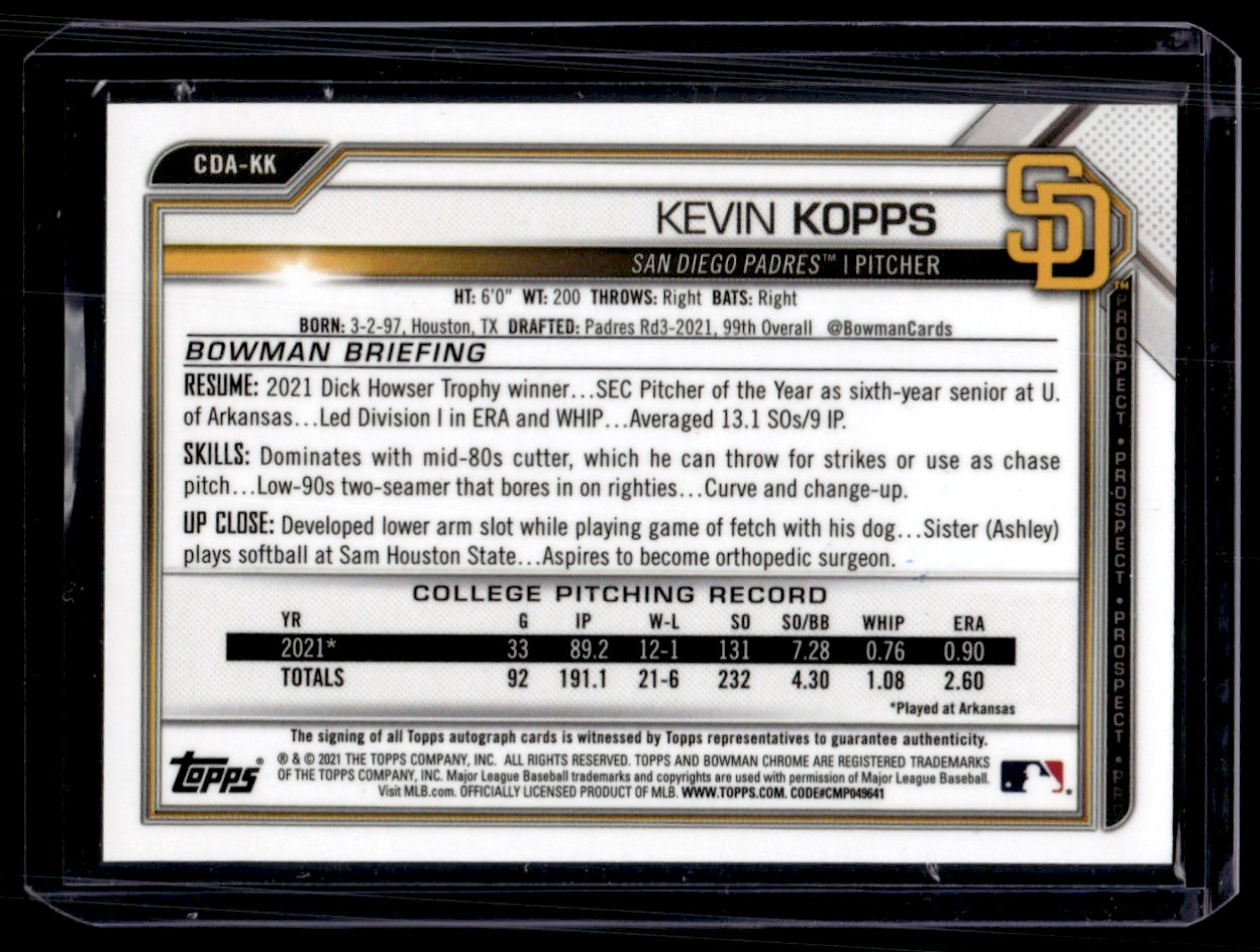 | 2021 Bowman Draft Chrome Kevin Kopps Auto San Diego Padres #CDA-KK |