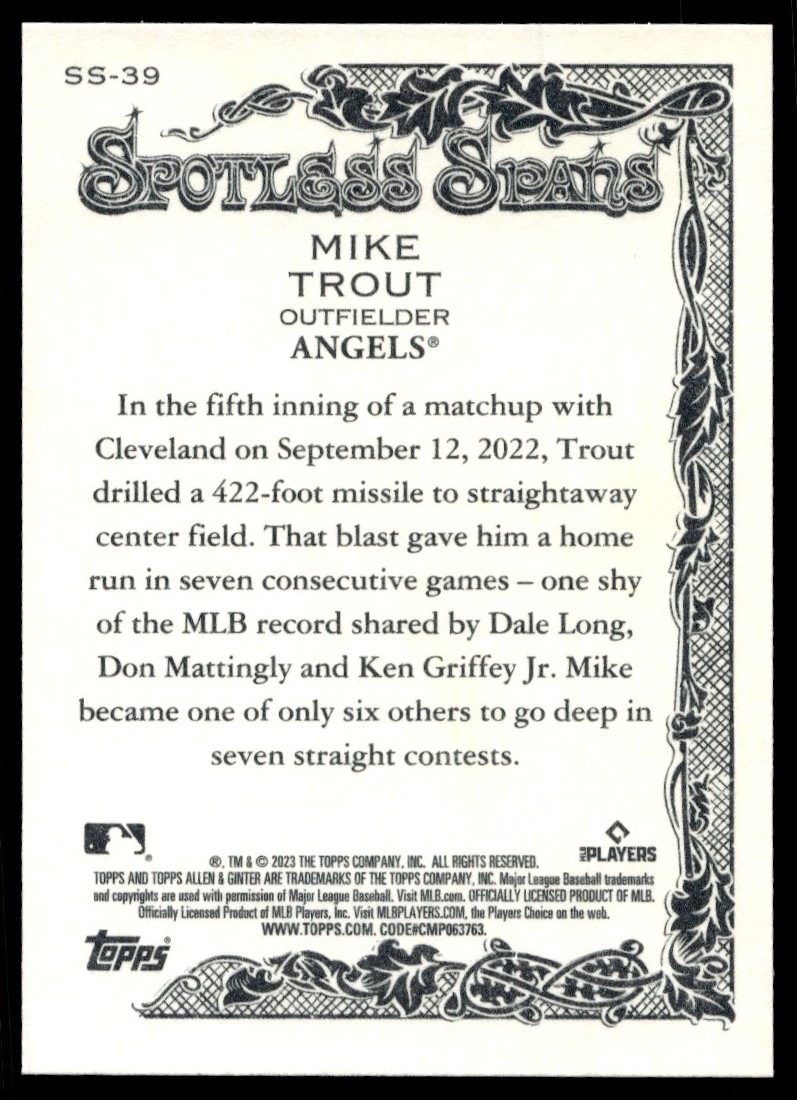 | 2023 Topps Allen & Ginter Spotless Spans Mike Trout Los Angeles Angels #SS-39 |