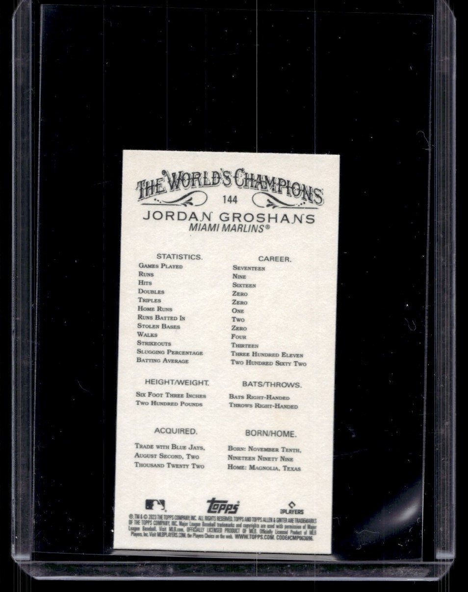 | 2023 Topps Allen & Ginter Mini Black Jordan Groshans RC Miami Marlins #144 |