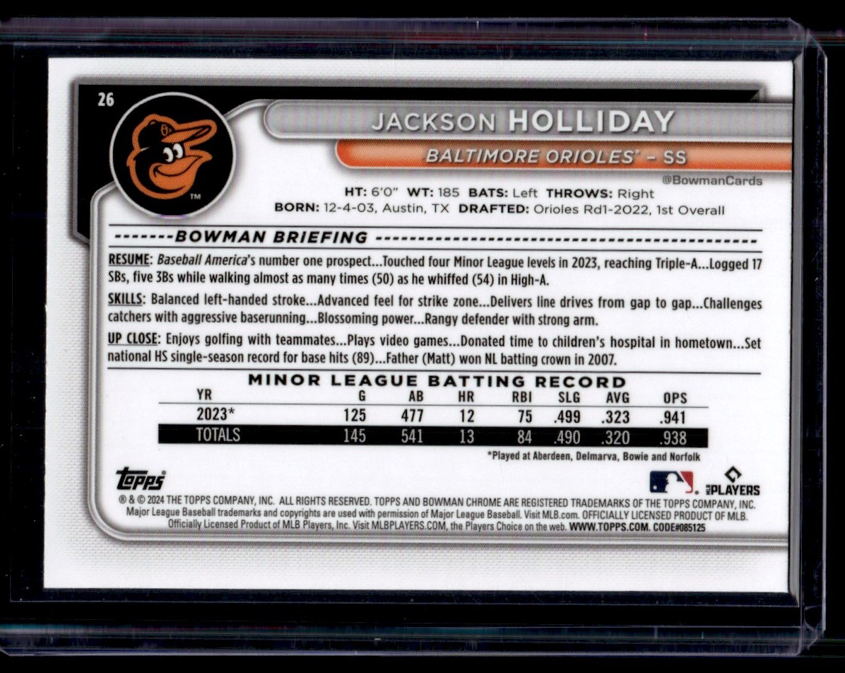 | Description: | Jackson Holliday | | Category: | Baseball | | Year: | 2024 | | Product: | Bowman Chrome Image Variation | | Team: | Baltimore Orioles | | Card Number: | 26 | | Rookie: | Yes | | Dimensions: | 3¾" x 3" | | SKU: | BL B0175 R01 A (33) |